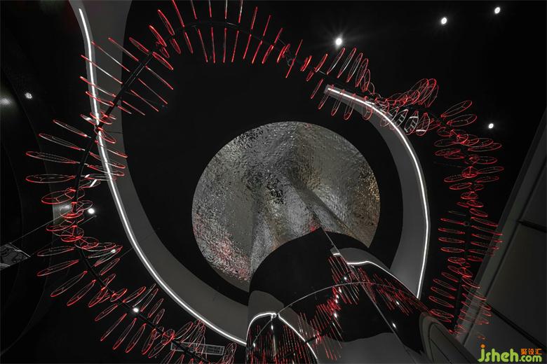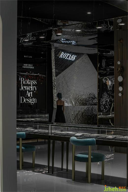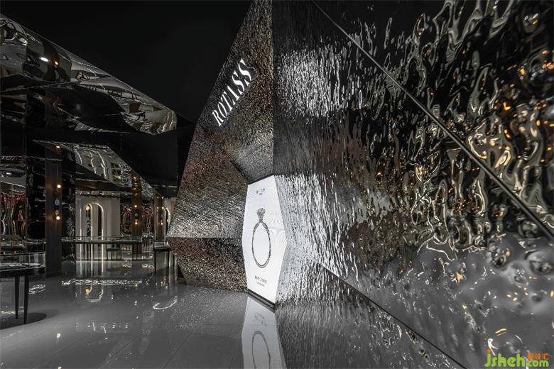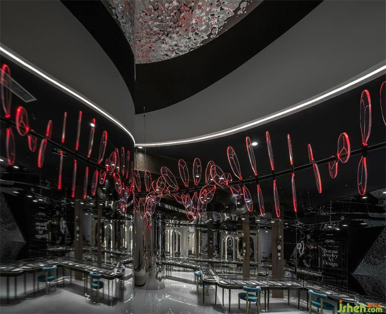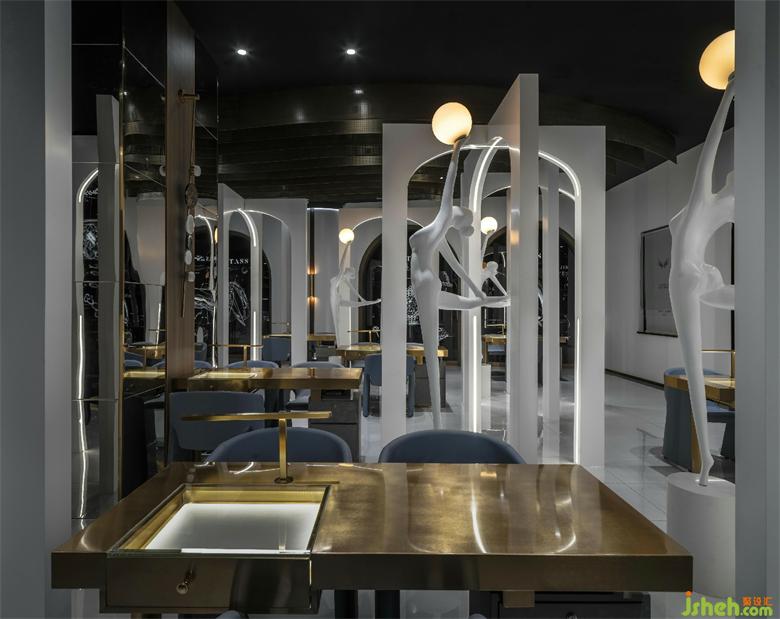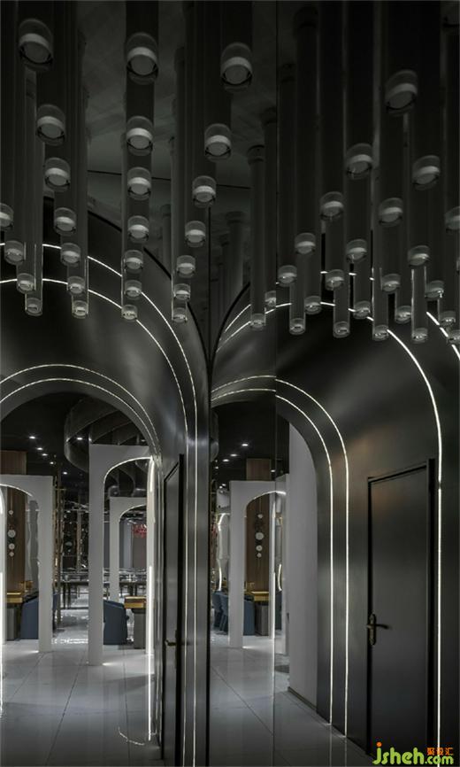 The middle hall is a negotiation area for jewelry sales. The designer uses a large number of arc-shaped arch elements to create a solemn and grand ceremonial atmosphere. In the center of the negotiation area, a large number of cross-shaped hollow vault partitions are divided into several independent areas, which not only ensure the privacy of customer negotiations, but strengthen the effect of space depth of field. The artistic lighting and modern modeling are interspersed between the partitions, forming a mirror effect on the one hand, and showing the hazy beauty between virtuality and reality on the other.