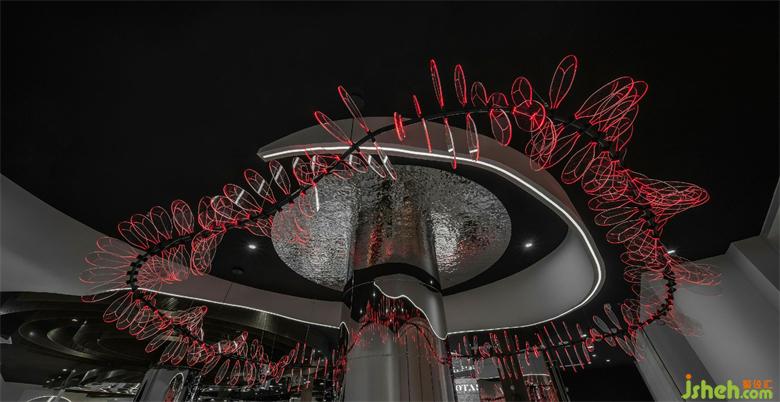 The feature wall is decorated with the corrugated sheet material the same as the front hall. The artistic shape of wapiti reflects with the reflection of the ground, effectively enhancing the texture of space and the artistic atmosphere. The fantastic and elegant shape design is consistent with the aesthetic orientation of contemporary young people, making the space closer to the target customers. The designer skillfully uses the primacy effect to accurately grasp the preferences of target customers and stimulate the resonance of aesthetic ideas.