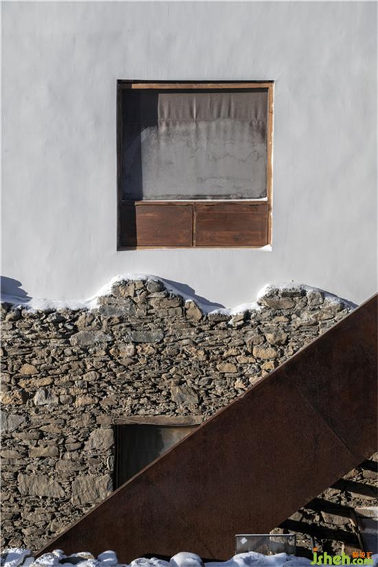 在整体民宿的一层,雅拉野奢温泉民宿设计师保留了原有藏民民居的石砌结构和木质立柱,尽可能地将它们身上的历史印迹延续下去,让每一位居者都能奢享山野之中的原始风味。在部分断墙处,用现代白色涂料加以衔接,在原始与现代的对比和交融中,刻画出时光流动。