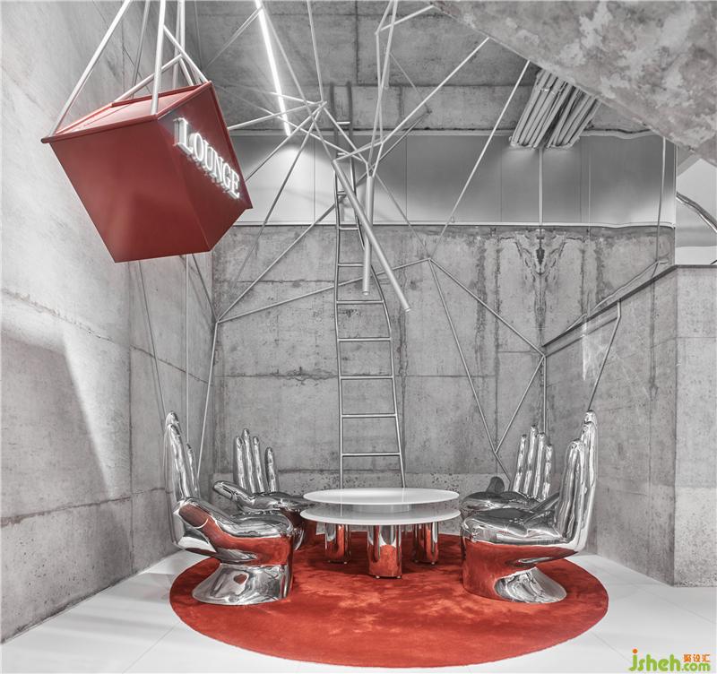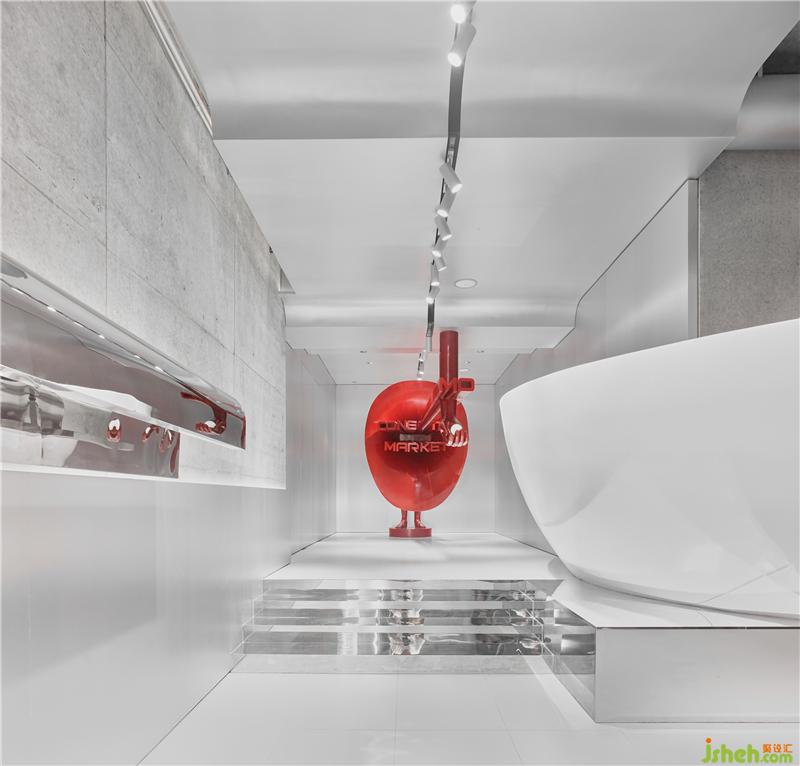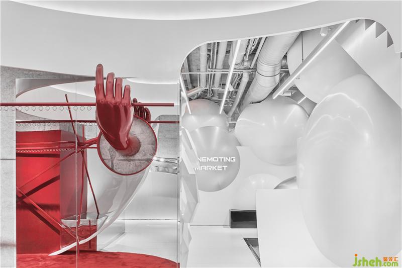 Conemoting market的空间叙述语言几乎可以是放任的,寓言,幻觉,伤痛,童真,陷阱,暧昧,药店,警告,科幻,抚慰,阶梯,经典,剧情,可爱,黑白,红色和欲望都被和谐地安置在一起,580平方米的空间是一个制造“线上人间”的剧场,在这里服装高级地成为思想的表皮,咖啡可以是弄骚的道具,那么一楼的酒吧应该是通往魔界的火箭!