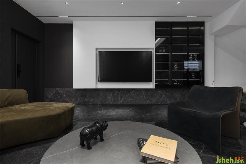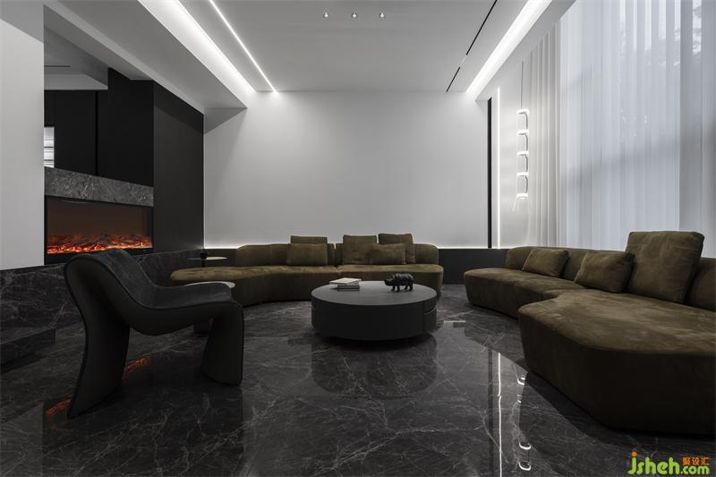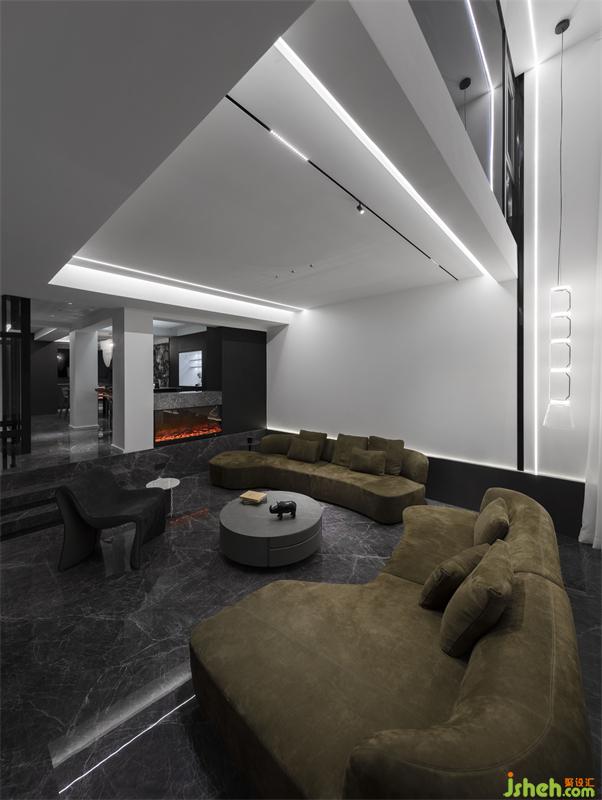 本案打破别墅原有建筑外观的局限框架.结合居住的生活需求,从空间的营造上出发。现代元素的既简手法。会客厅的下沉式结合部分挑空。围合感十足。即保留外建筑原有的弧形窗不被功能的抵用而有所破坏,同时增加了空间的合理利用,高低位收口辅助天际线的穿梭连贯,拉高了视觉上会客厅的高度,别墅设计保留原有别墅高厅的味道,又增加了2楼房间的悬浮感。