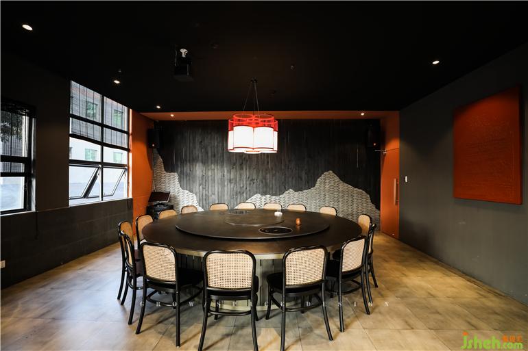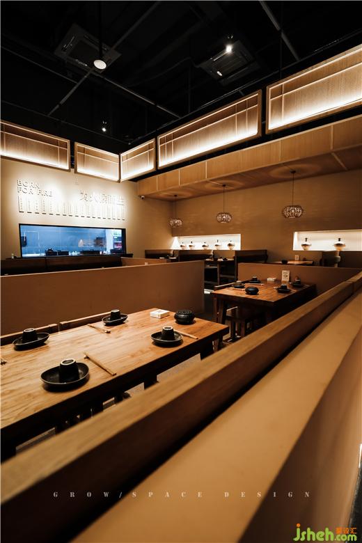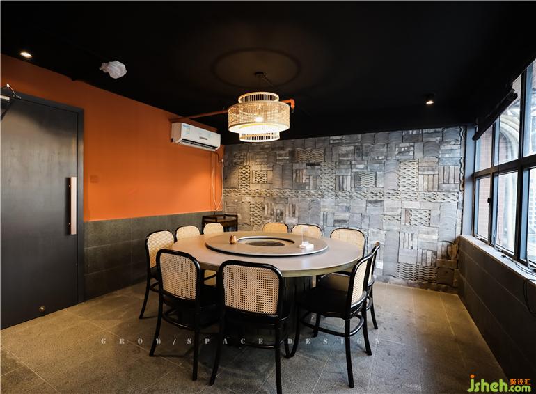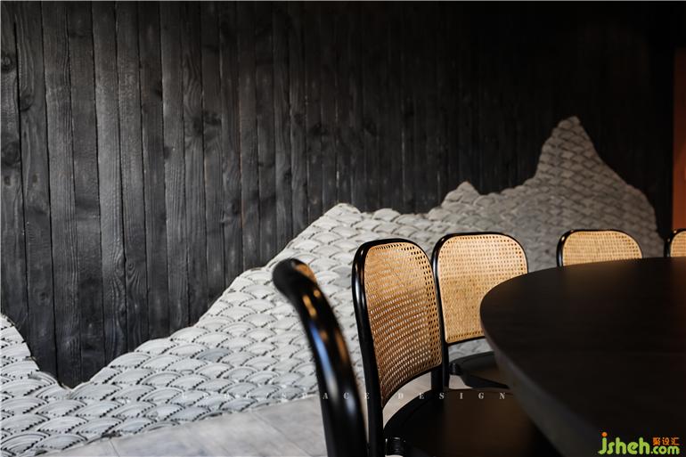 啫啫煲是“玩”火的一种粤菜,控制火候对其相当重要。软装搭配,挂画,以及硬装部分运用的炭烧木,都与火息息相关。