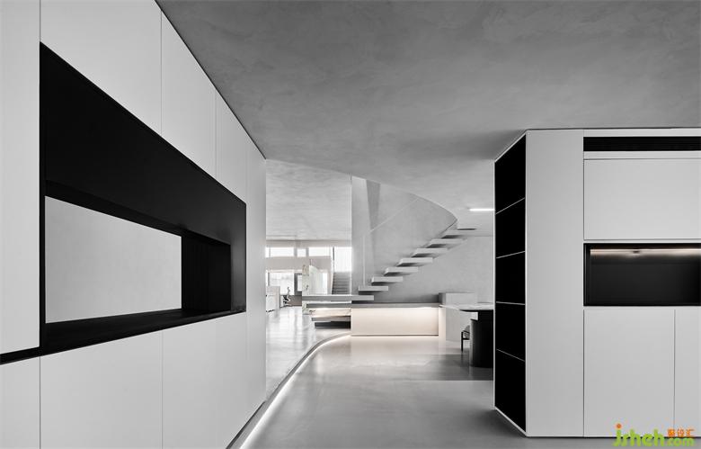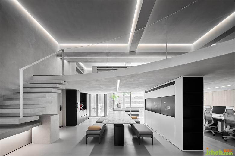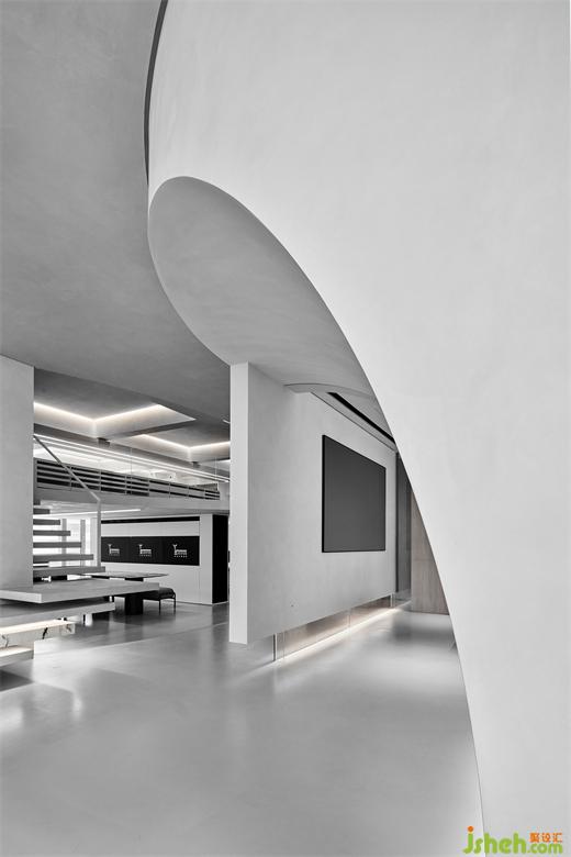 办公室设计师直言:“我们从来没有反对在建筑本身的雕塑性,但我们反对完全抽象的表达和无意义雕刻的建筑。”办公区摒弃了许多外在的不必要的装饰,而是秉持着尽善尽美的思想,灵活运用材料,并结合简洁克制的形体,实现空间组合的虚实结合。建筑所体现的先锋美学呈现出丰富、深厚和立体的特点,消解了现代主义建筑的纯功用意涵,提炼出一种人性化、象征性、互文性的新语汇。