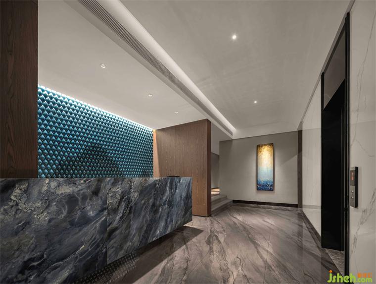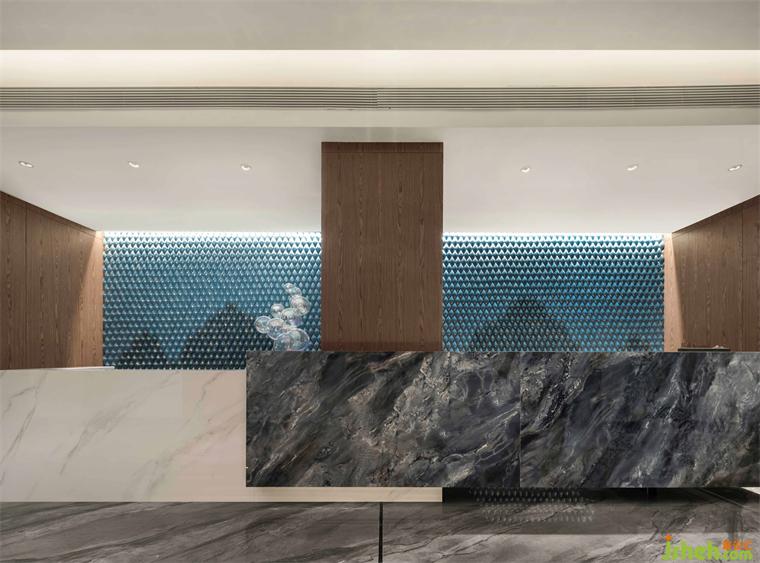 踏足大堂,酒店设计大堂空间的视觉亮点——碧蓝色陶瓷墙画是岭南天地脉络的抽象写意,运用艺术的手法,自然山水宛然若画,光影交相辉映中,不着痕迹地开启人文体验。