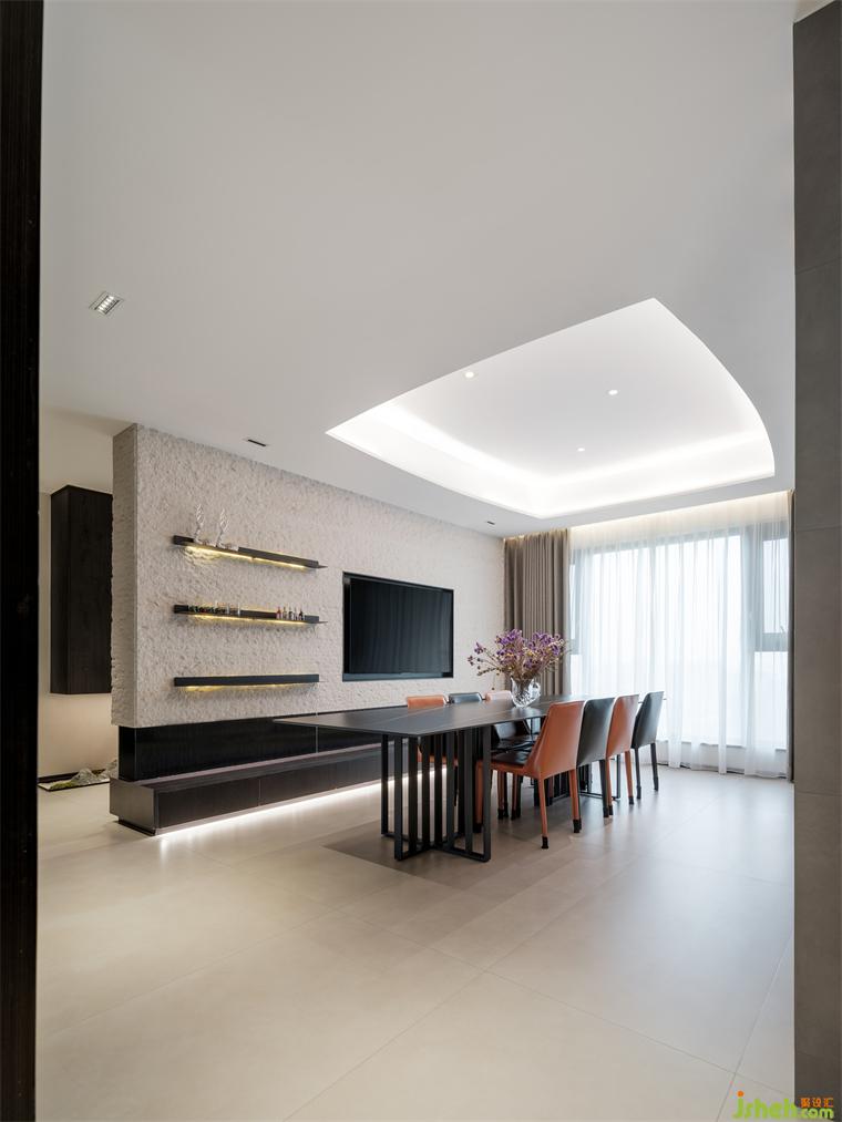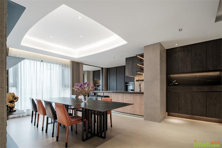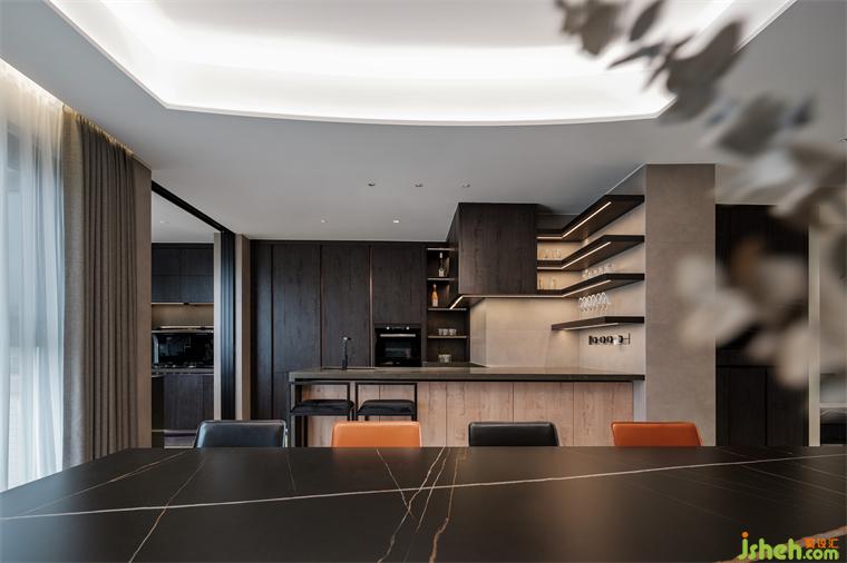 餐厨区维持色调统一时也让暗色增多,色调下沉营造静享美食的氛围。餐区的荔枝面天然大理石与弧形天花,同客厅细节遥相呼应,橙黑餐椅平添几分视觉的小惊喜。