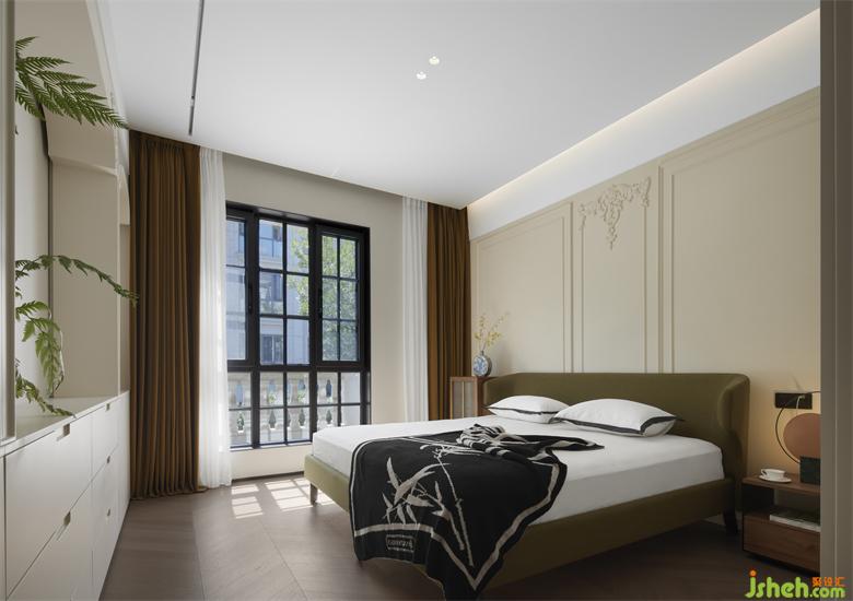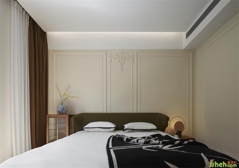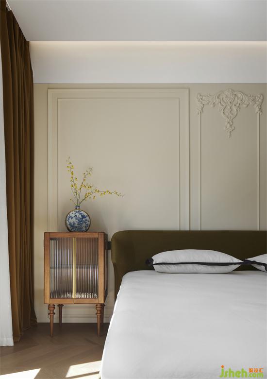 复古是致敬,亦是创新。在复古情结的启发下,易昂设计重新提取早已被时间印证过的经典元素,熟悉的符号,以现代的笔触,重新去描摹。设计没有过多的干预卧室空间,留给了静谧的氛围,却又胜在韵脚。雕花石膏线以细节处的精度,四两拨千斤,升华了整个空间的格调。