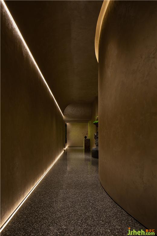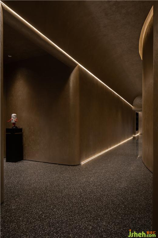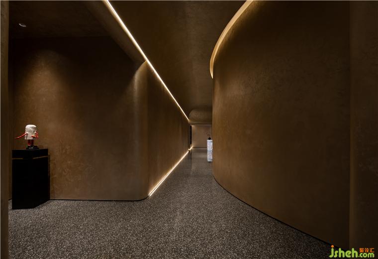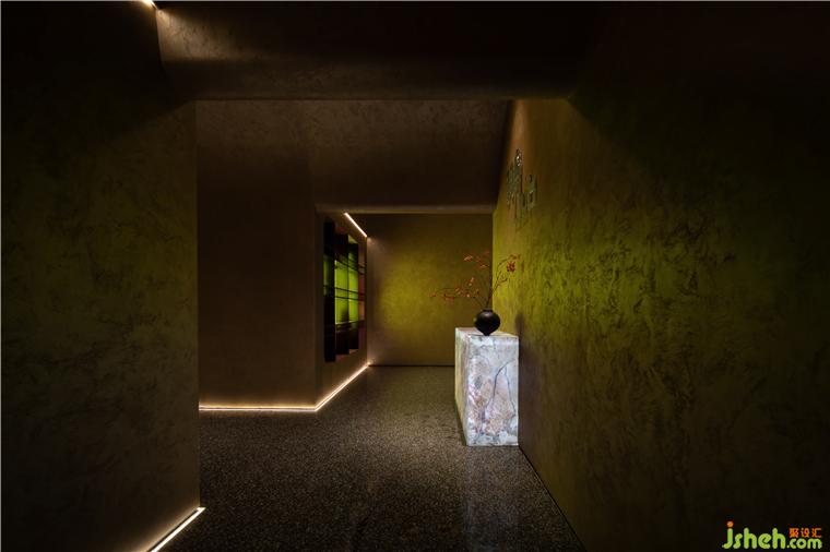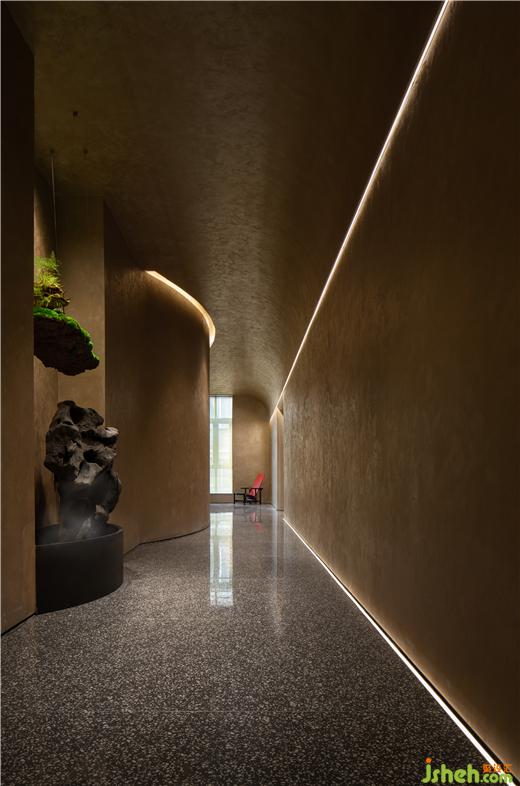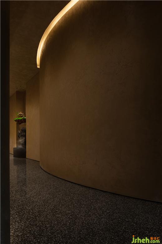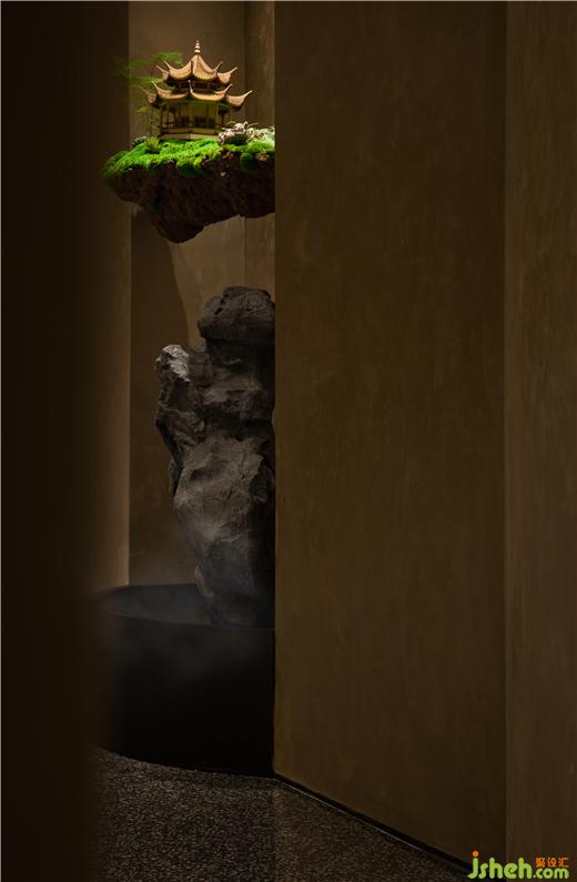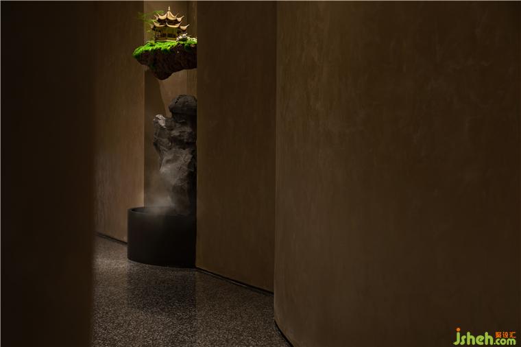 园林之趣一则是廊庑庭院的九曲连环,一则是翠植怪石的奇崛清姿。CLUB设计在走廊折转处布置山石虬枝的古典园林造景,坚韧遒劲的姿态与室内一贯的含蓄风格形成鲜明对比,为空间点染出艺术之魂。