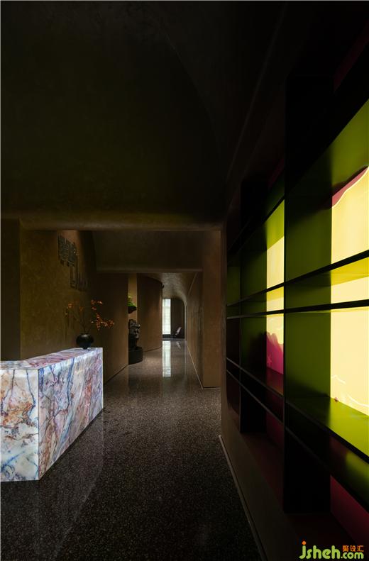 初入前厅,大理石前台捕捉人的第一视觉,CLUB设计以蜿蜒的纹理、挺拔的姿势屹立,抽象又柔美,承载着有人、自然与空间的根系深思,映射人们对自然的终极向往。