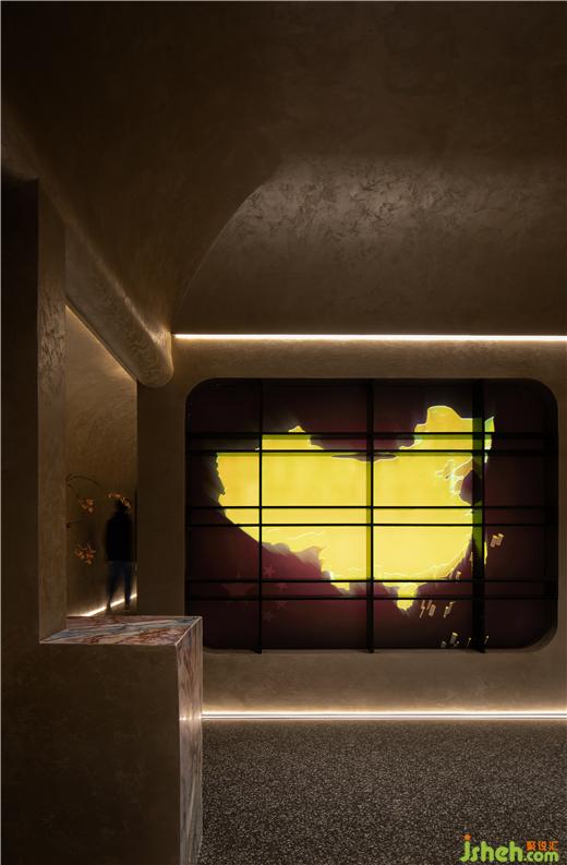 剥落微光浮动的外壳,空间的文艺气质由此涌现。室内以深褐色为水泥为基底,空间动线迂回、转折,让顾客在探寻中不断触及园林文化的内核,加深若即若离之感。
