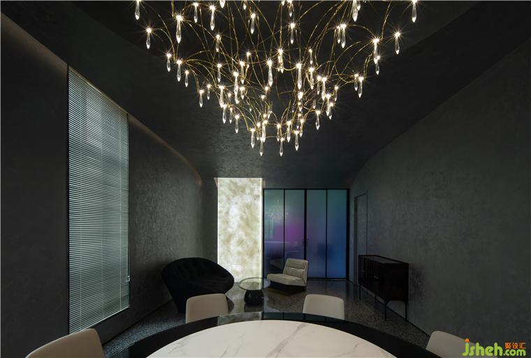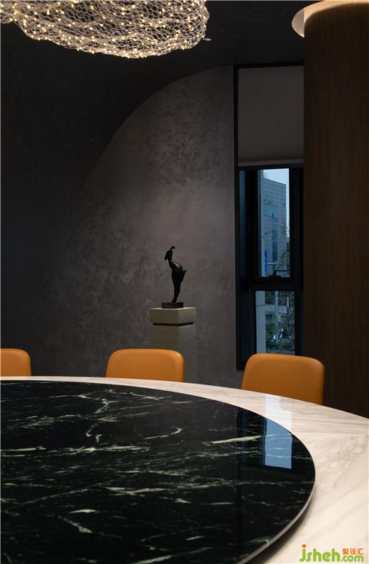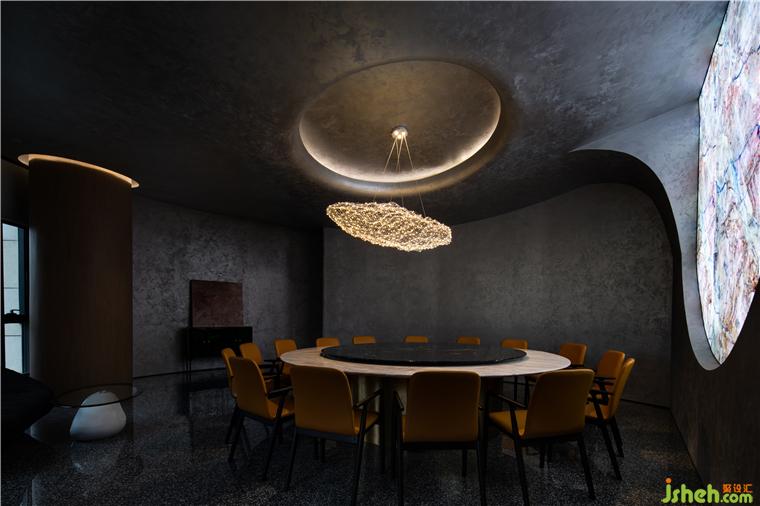光影交错,顶面的云朵吊灯为空间展开无限想象,结合雕塑的空间表现,CLUB设计将材料自然的“拙”与空间能量的“引”充分表达,在显示与想象之间架起了链接时空的关系。