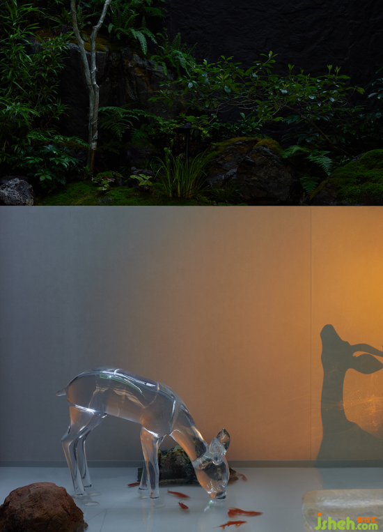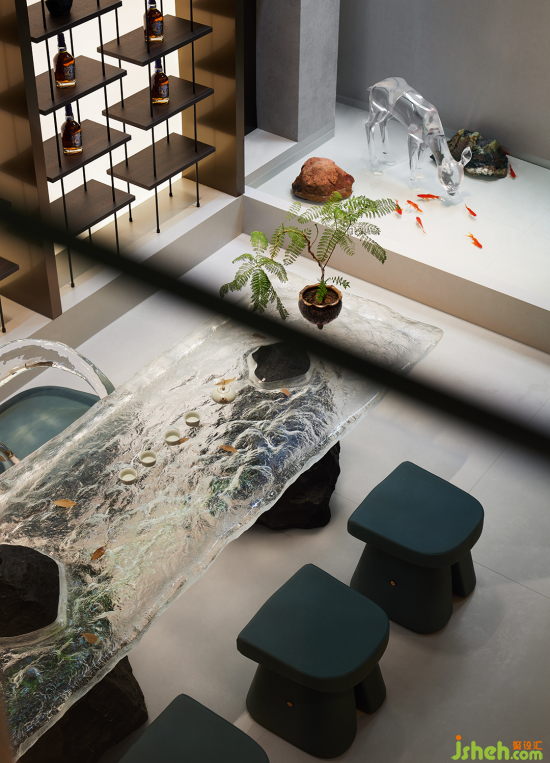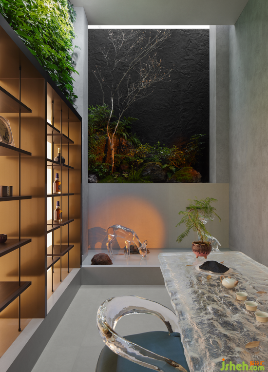 偷得浮生,饮茶片刻之闲。茶室区域的流纹玻璃茶桌、玻璃扶手圈椅尤为点睛,与黑色原石茶凳既对立、又呼应,清风缥缈的空灵气息从天窗而至,逐渐以小见大的开阔迎面而至,雅俗便可共赏。