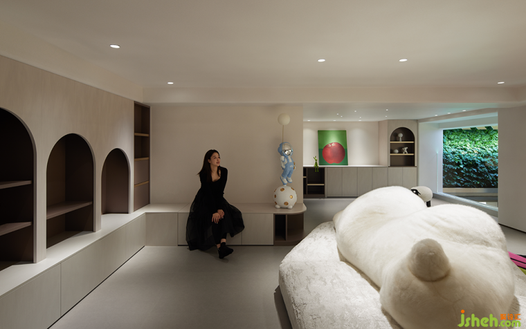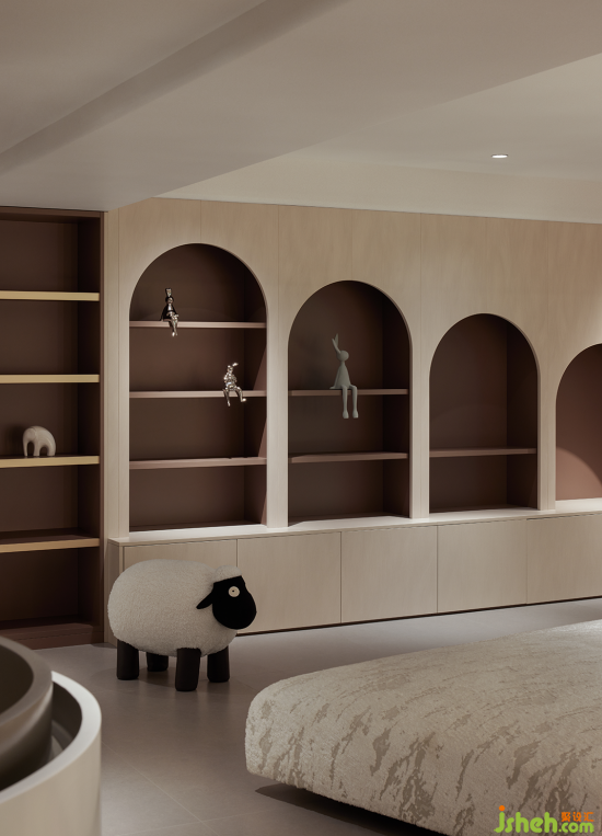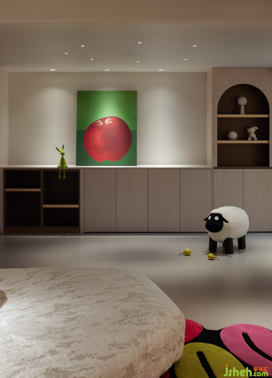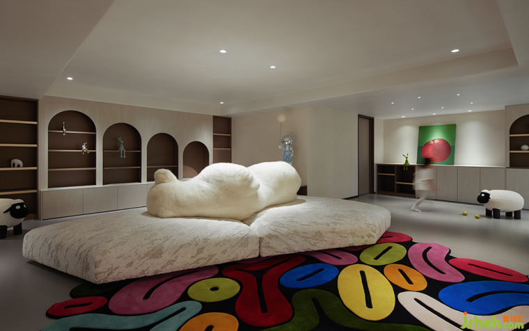 夹层处的休闲放松区域是适合亲子共度的空间,也是家中欢笑最多之处,设计师用柔软家居材质和温和弧度线条将其温柔包裹,将外界纷扰情绪一一摒弃,只享受此时此刻的甜蜜时间。