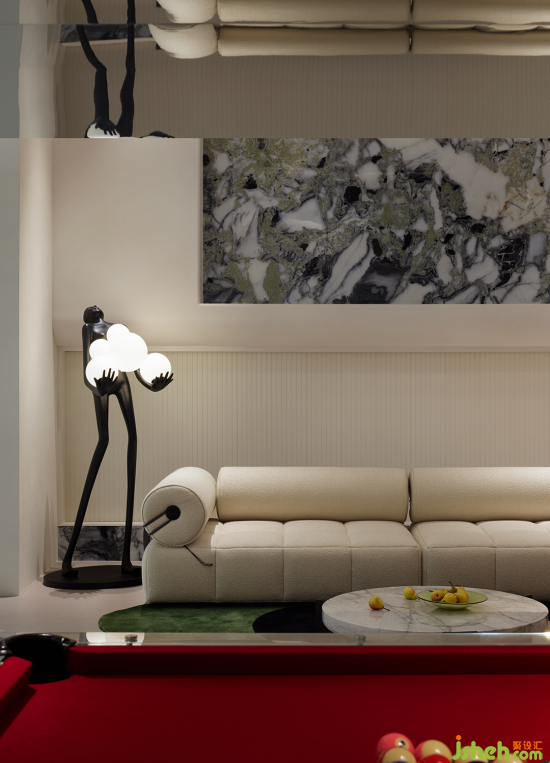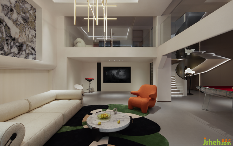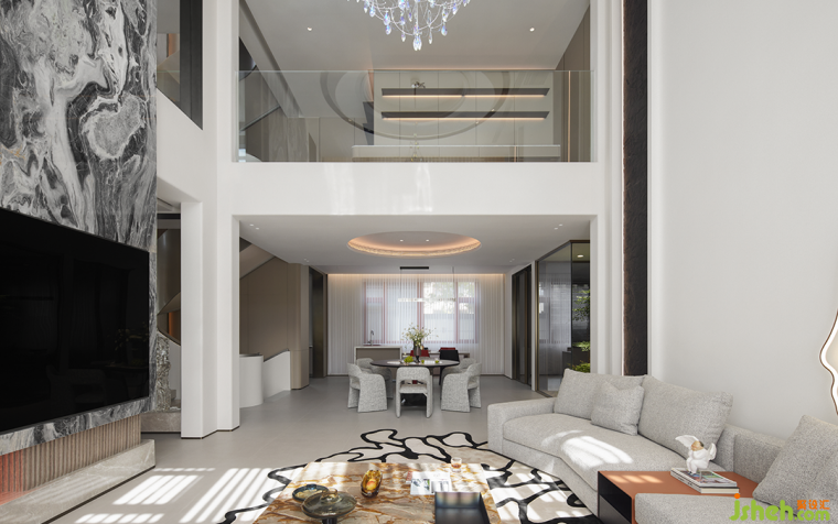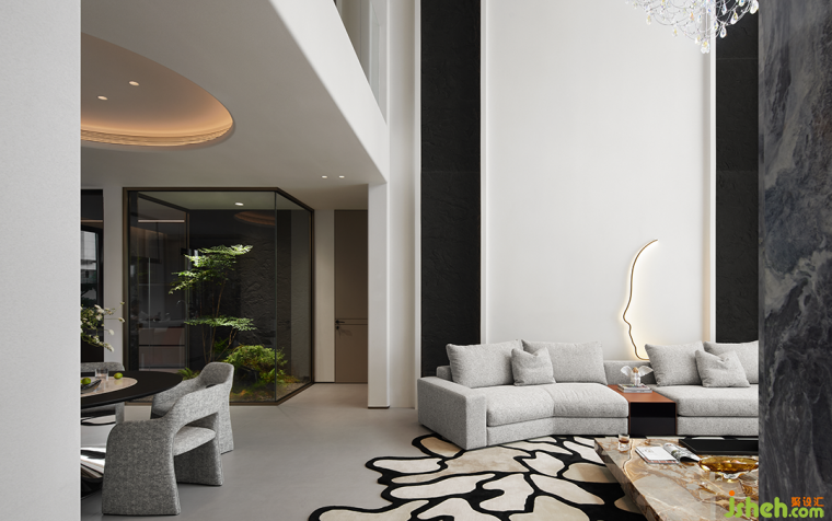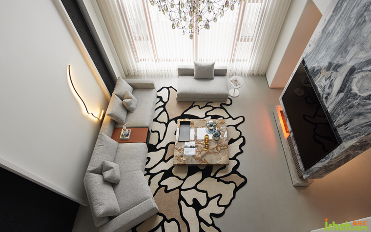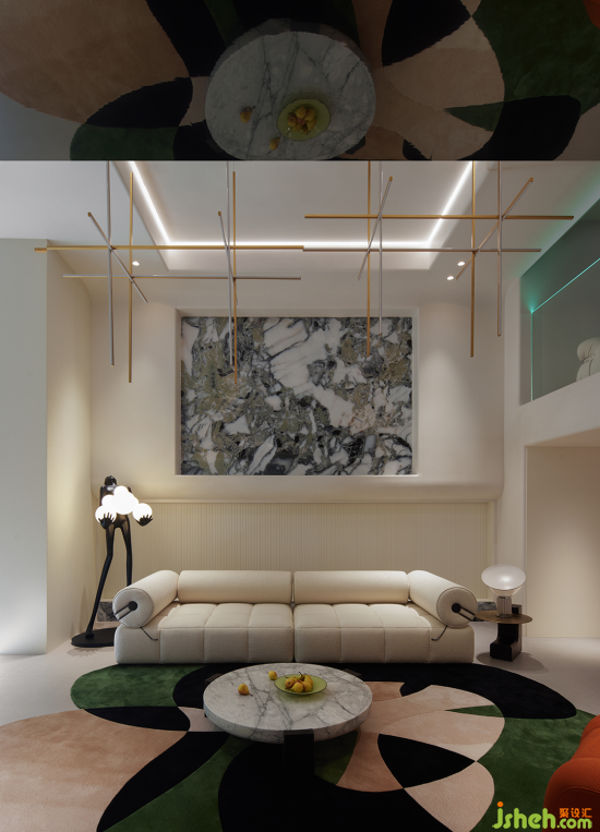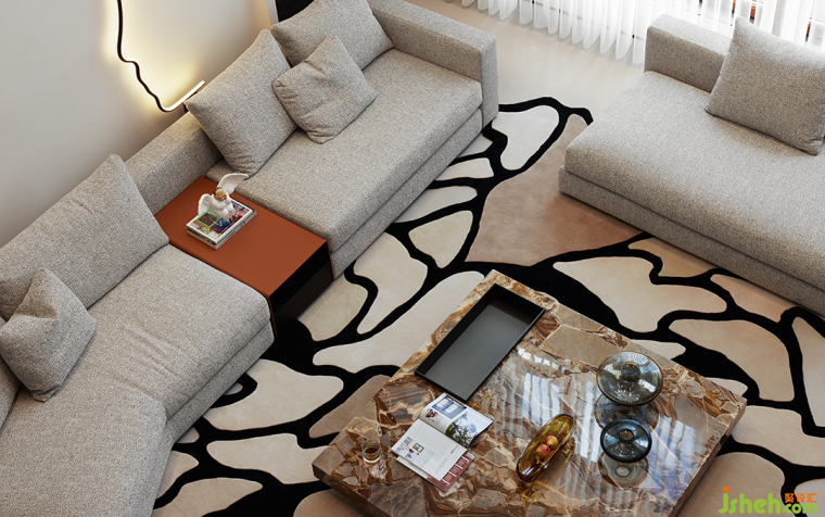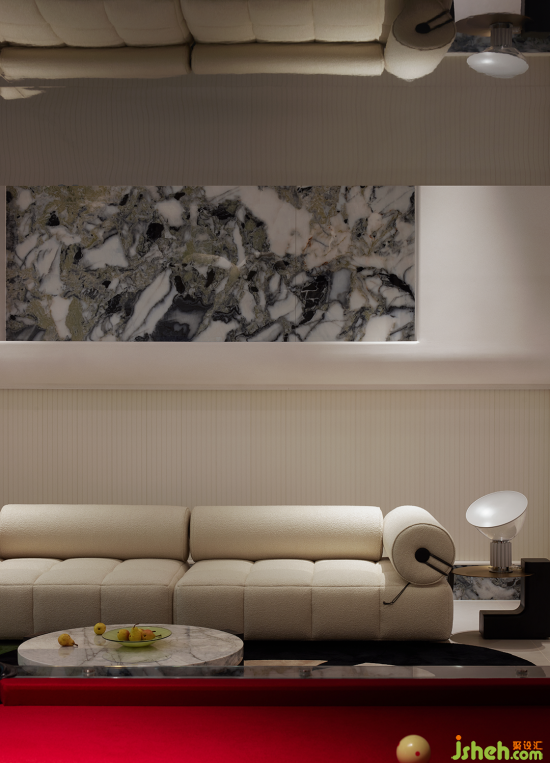 大理石背景照壁、不规则艺术拼接地毯和石质方正茶几荟萃多重质感,丰富了空间层次,激发出更多蓬勃生机。