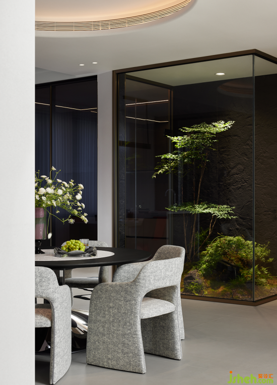 设计师将餐厅的位置有意前挪,位于客厅与餐厅空间的中心视角处,家人宾朋可在视线汇聚处举杯共饮,尽享欢愉时刻。自然的造景角落也是设计师匠心独运的设计所在,用石块、土壤和绿植打造的真实梦境,奇幻至妙、生机盎然。