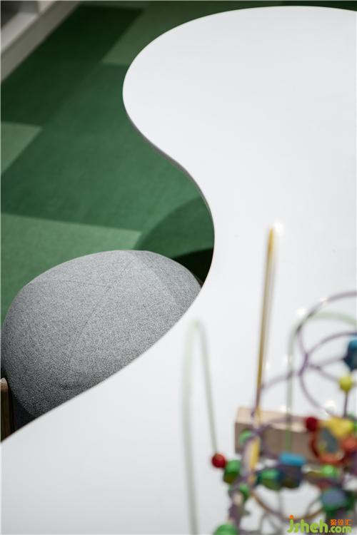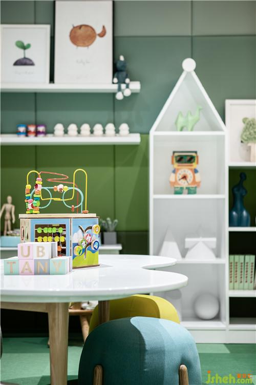 儿童娱乐空间运用了低饱和度、不同层次的绿色,以最纯净的形式、最精简的手法,打造孩童专属的时间、空间,阅读、益智、折纸、画画,执梦于生活之上,将生活融入梦想的点滴,温暖了时光。
