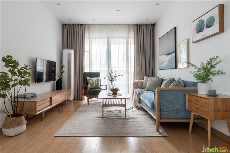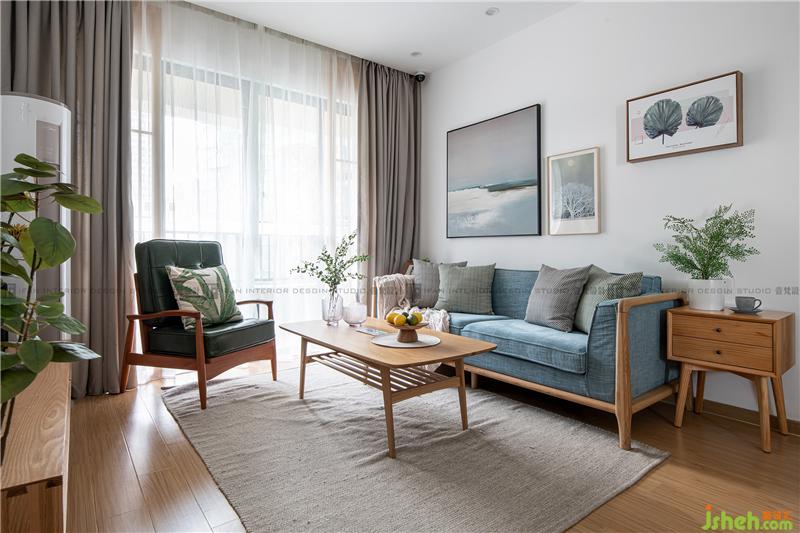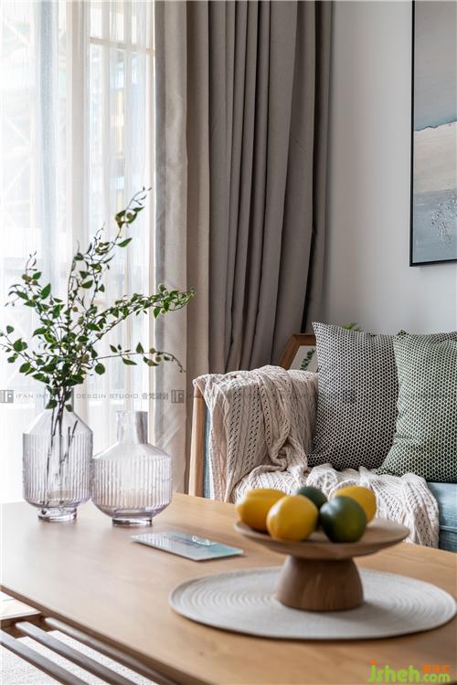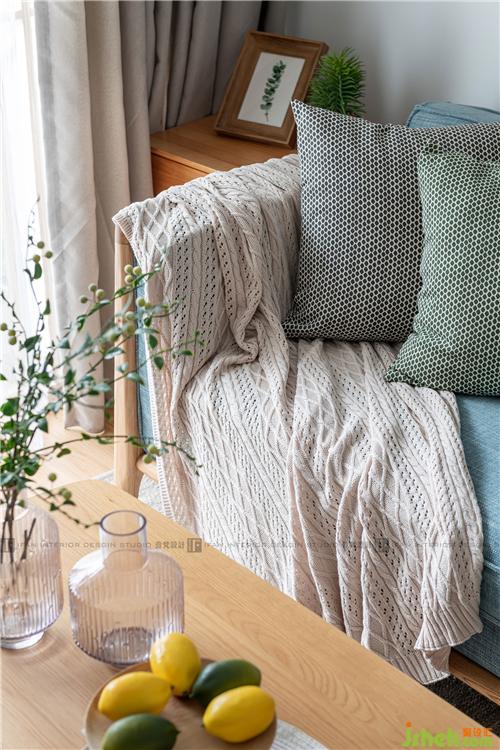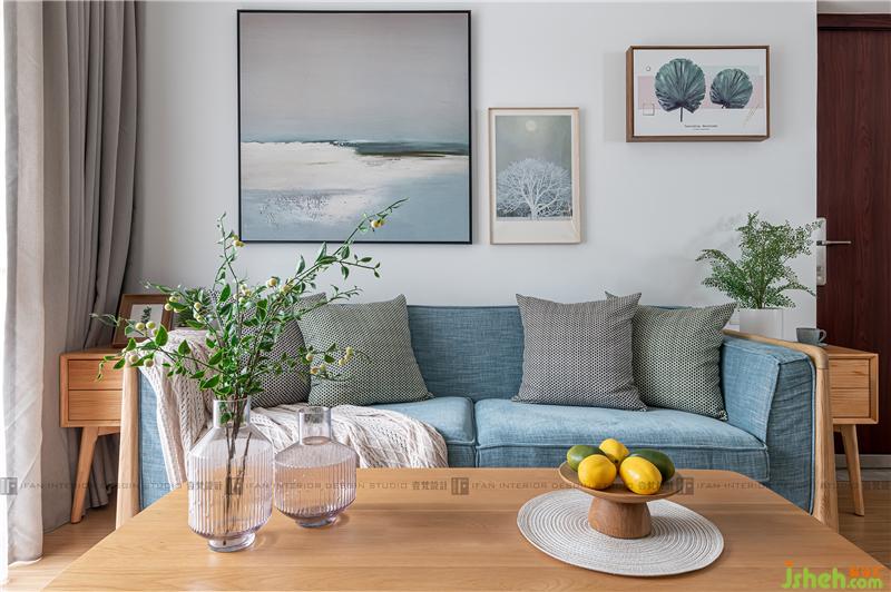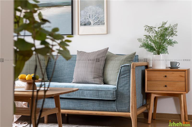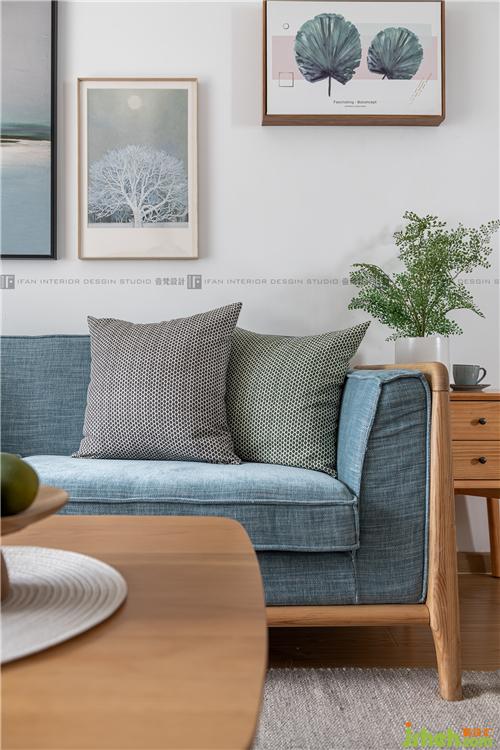 通过洁净的白色与自然木色相结合,整体空间温润轻盈;布艺的蓝色沙发与同色系的海浪油画,不论从哪个角度看,都有“目光所及都是温柔”的感受;绿油油的植物,以生命的方式存在还是绘制在布艺上,都散发着生机勃勃的气息,让人舒适轻松。