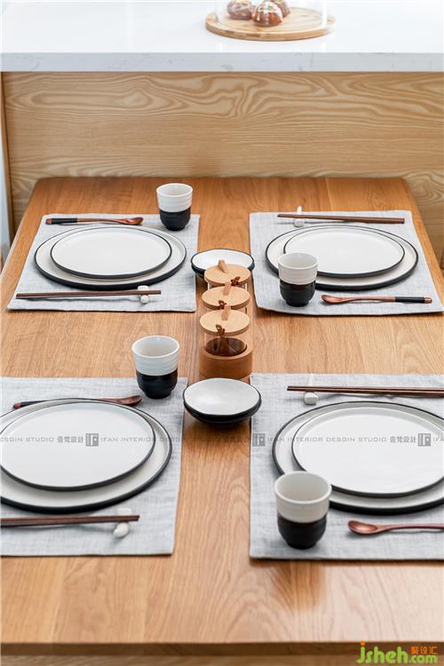 木质与皮质打造的餐桌椅,搭配极简吊灯,现代与自然元素的结合,餐厅温馨大气;在暖色灯光下,餐盘上的食物也变得更加可口了。