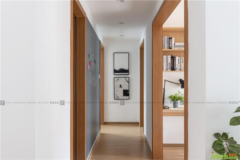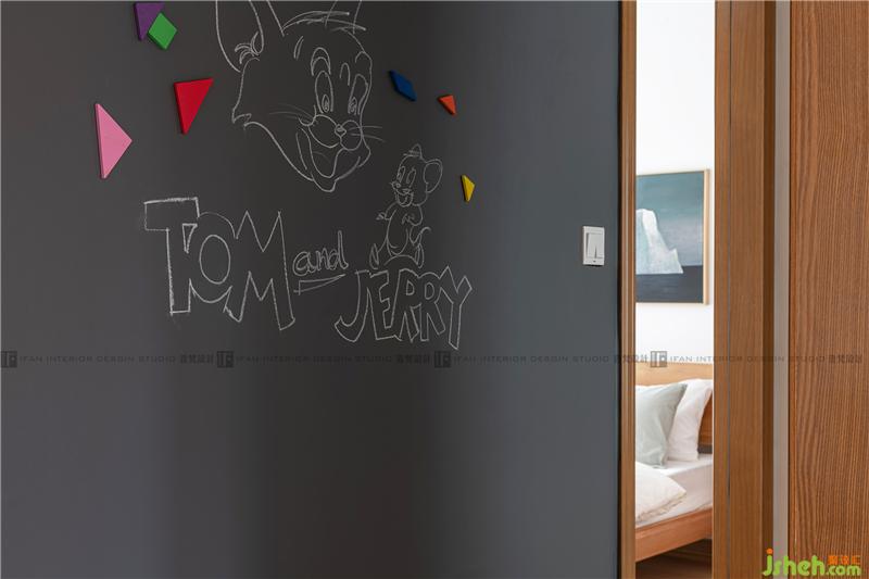 尽头的装饰画让过道不在单调;一整面磁性黑板墙的设计,小孩可以随心在上面涂鸦,室内设计师这不仅能丰富孩子的生活,记录成长趣事,父母参与进去,更能增加家人之间的互动性,提升家的温度。