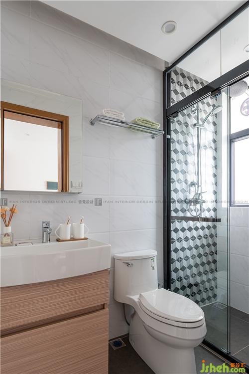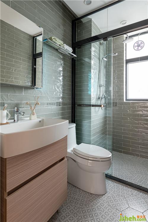 单一的纯色系长期下来很容易让我们视觉疲劳,在卫生间铺上灰绿色的面包砖、六边形花砖、几何墙砖,调和空间的情调。