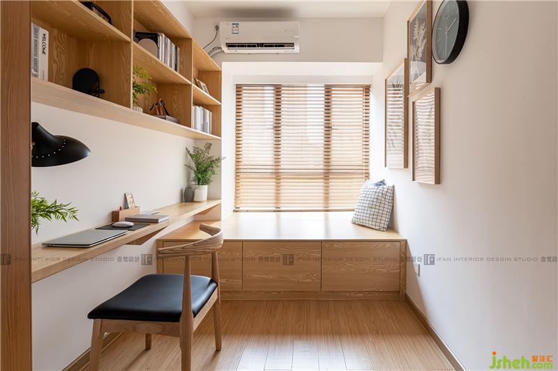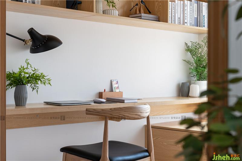 书房做了书桌椅、书架之外,还做了一个榻榻米地台,方便工作之后休息和充当客卧。室内设计师开放式书架承担着展示架的功能,可以摆放各种屋主喜欢的装饰品和书籍。