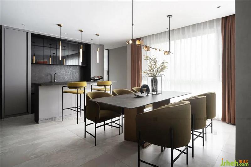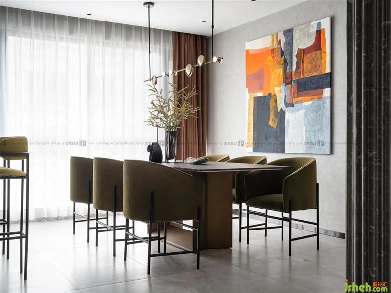 相较于客厅空间的轻柔,用餐空间更偏向低调奢华,金铜吊灯、丝绒座椅深圳装修设计、大理石台面、高级的橄榄绿,恰到好处的精致,营造出低调温柔优雅的质感;