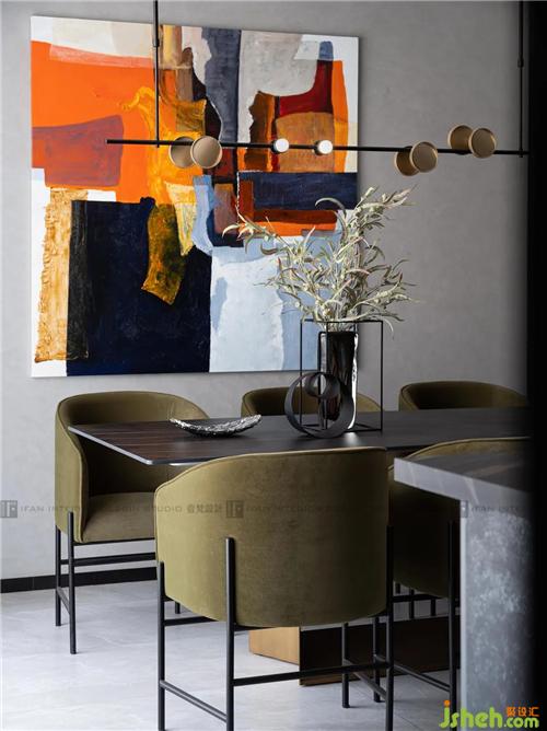 绚丽多彩的油画如四月花海,橄榄绿的座椅如一簇一簇草丛,就这样把春天搬进家里。