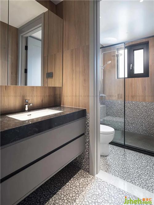 洗手台外置的客卫,大大提高生活便利性;木纹砖拼接水磨石瓷砖的墙面,与客厅的哑光岩板相呼应;