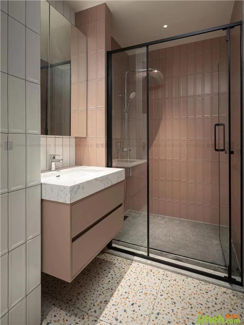 女儿房的卫生间墙壁铺满小而精致的粉色、白色瓷砖,淡雅又清新宜人,让人心情变得轻快愉悦;较为磨旧的地砖不仅防滑,也迎合了淡雅又不单调的调性。
