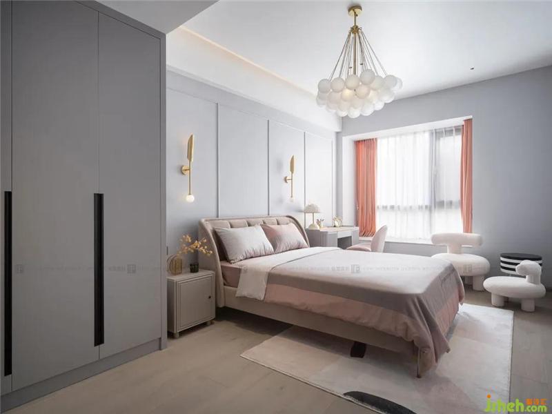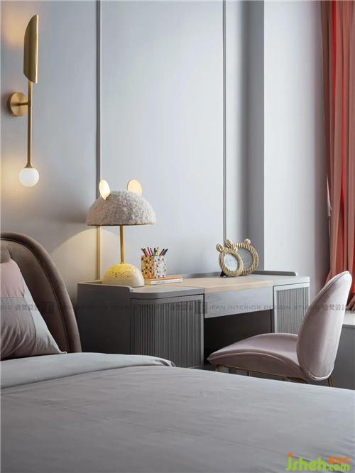 简单纯净的卧室空间,选用低饱和度的莫兰迪色系,搭配低调奢华的金属深圳装修设计、丝绒材质,塑造空间层次、温柔高级之感,同时给小主人带来安静。