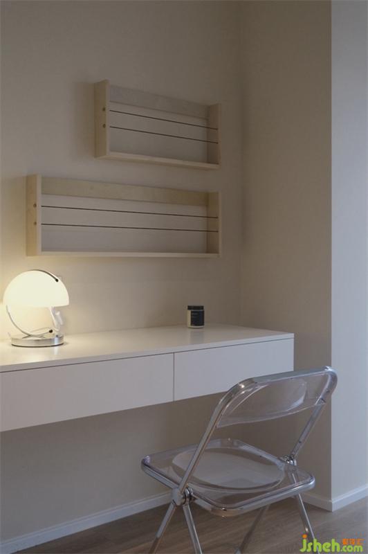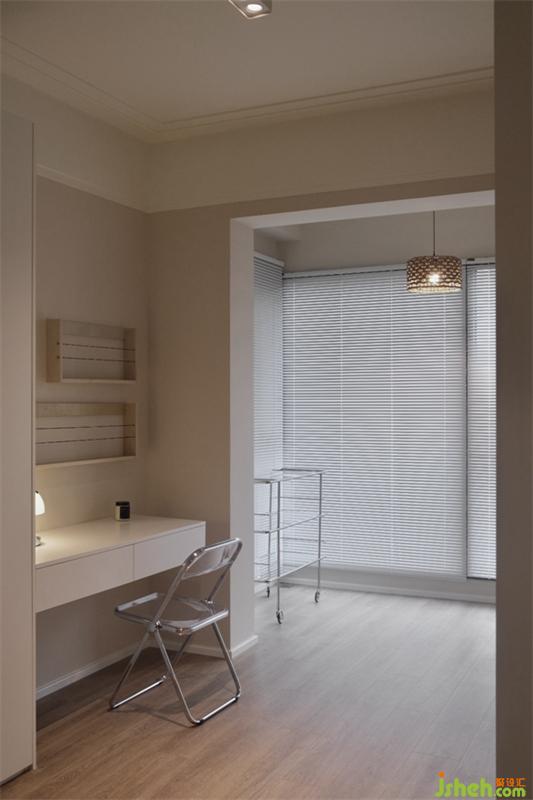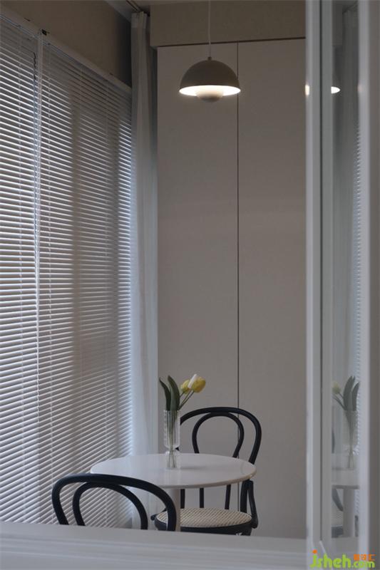 简洁干净的书房里面藏有一个小小的惊喜,白色的窗框将玻璃包裹住,轻轻的将窗户拉开阳台上小景展现在眼前,白色圆桌上花瓶里插着一朵小花,两把椅子随意摆放着,别有一番意境。小小的窗户也能让两个空间有了关联。