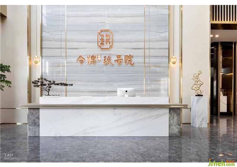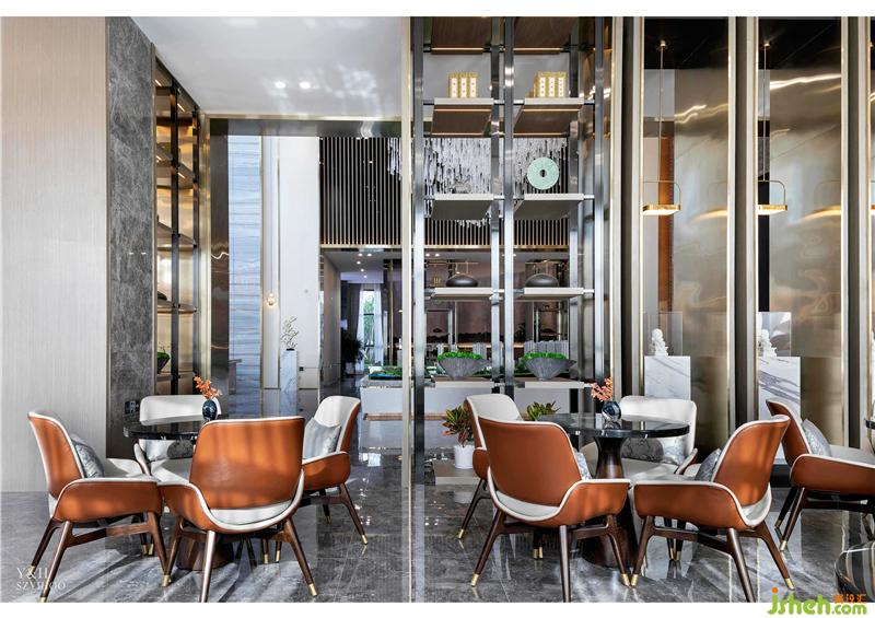 室内空间令人舒适的暖灰色调,金属、水晶以及墙上切割的造型,透过隔断墙隐约看到水吧洽谈区的场景,让这个平和而内敛的空间豁然开朗。