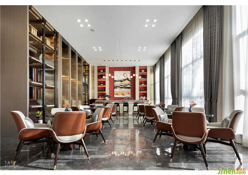 水吧区选用雅致的咖色皮革,让空间暖而温馨,墙面上的山水装饰画和吧台上的艺术吊灯的曲线造型相映成趣, “山”“水”连绵渲染氛围。