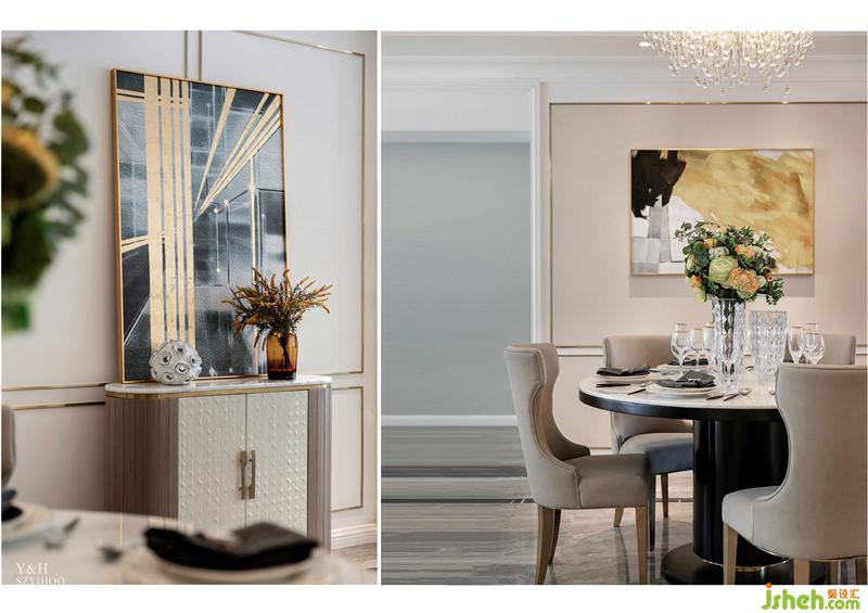 餐厅,皮质餐椅配上黑白色餐桌,让餐厅看起来端庄沉稳。灰色的墙面与灰色餐椅遥相呼应,空间在整体上简洁舒适。