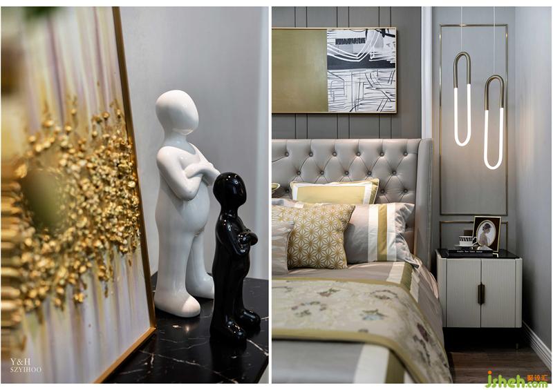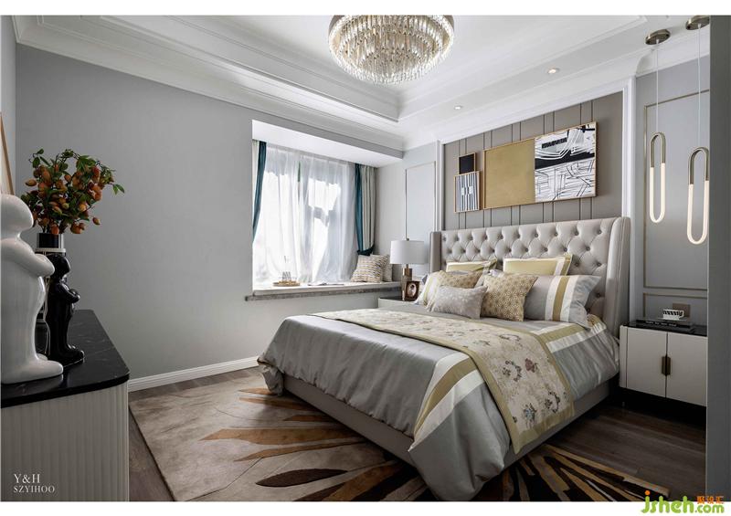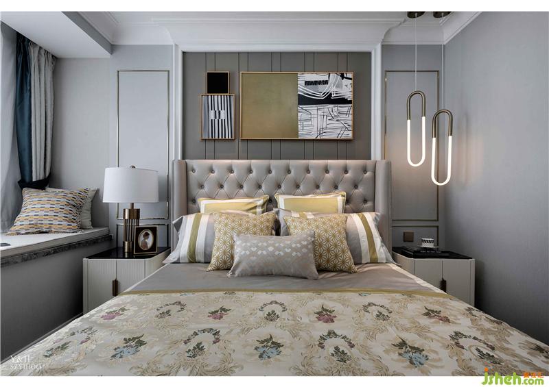 柔和的浅灰色给主卧营造了安宁温馨的氛围。床头两盏独特轻奢的吊灯为沉稳的空间增添了一丝趣味。