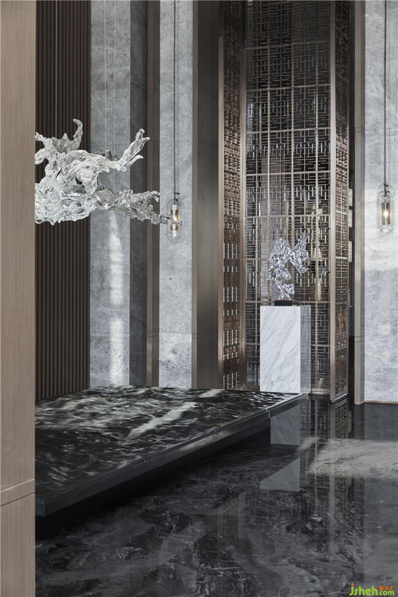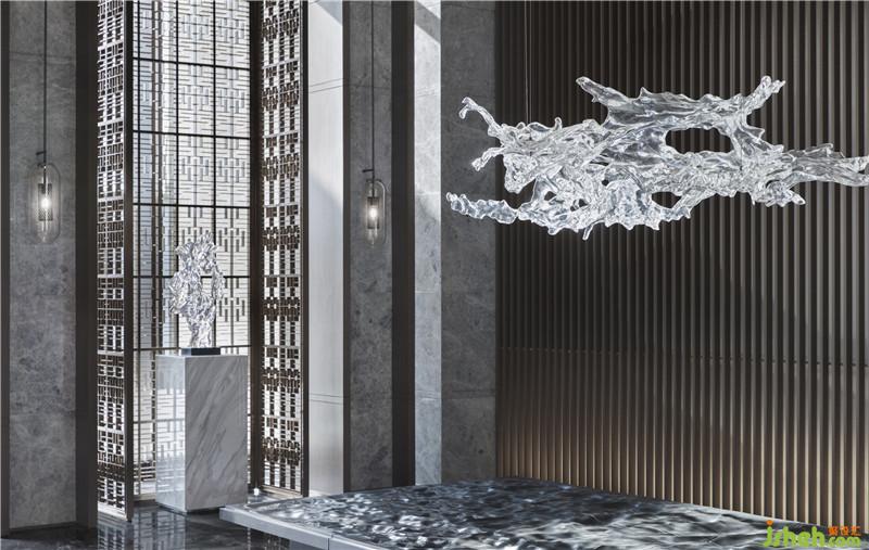 售楼处的入口被掩藏在一片植株与水景交错的景观中,踏上一段泉水涌动、山石成景的小路,一侧落地玻璃窗内是与外界产生对话的VIP洽谈区——从一开始的门庭空间,访客便能获得惊喜的体验感,“当我们站在桥上,与室内隔水相望,感官上就已经被快速带入一个全新的、画卷般的空间内。”EH DESIGN GROUP易和设计集团设计总监马辉把这种感受形容为情绪的酝酿,“室内设计与前厅之间的联结,为感官的容器慢慢注入情绪,仿佛踱步于山石园林间。”