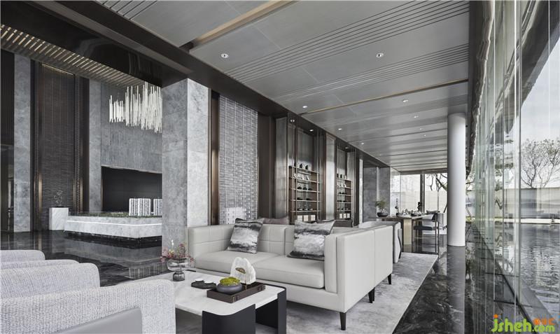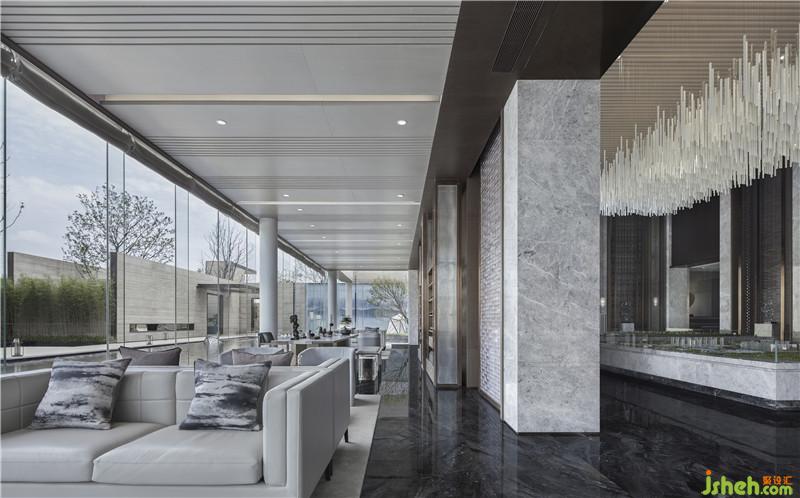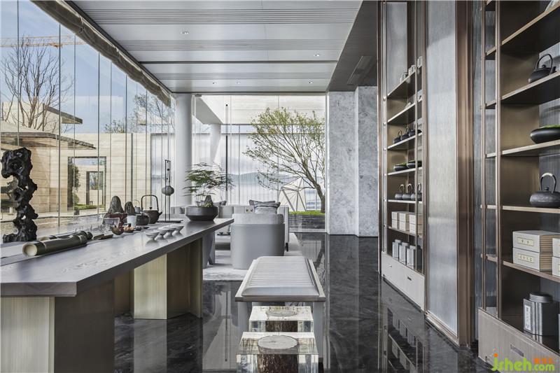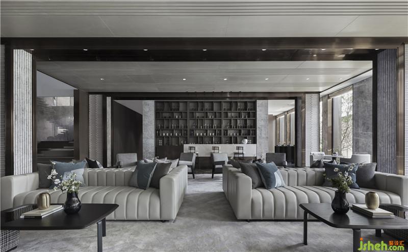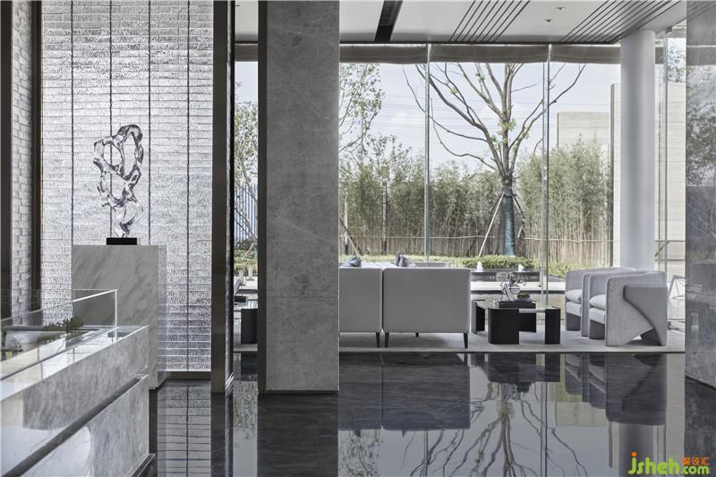 尊重每一次交流,享受每一段思考 —— VIP洽谈区位于沙盘区的左侧,以灰白色为主色调,铺陈近似水墨山水的东方基调,细腻地呈现出一个优雅、宁静的空间,同时自然地与窗外的水景相交融,影影绰绰的光感,更让空间灵动起来,孕育了无形的生命力。