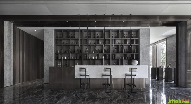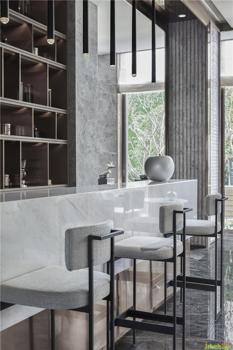 只凭单线条的勾勒,就散发出摄人心魄的力量,从吧台到沙发区,视觉区域内各种优质材质的运用——大理石、金属、布艺软包、陶瓷、玻璃,释放组合的魅力,在整体上以谦卑的方式作收敛,淡然的空间更能包容内容的喜忧。