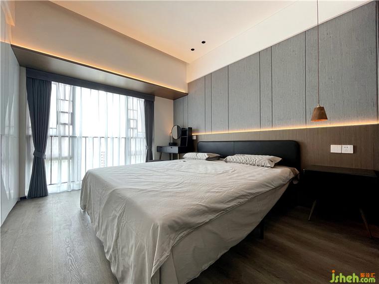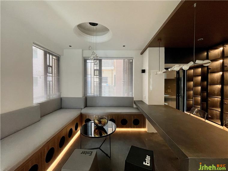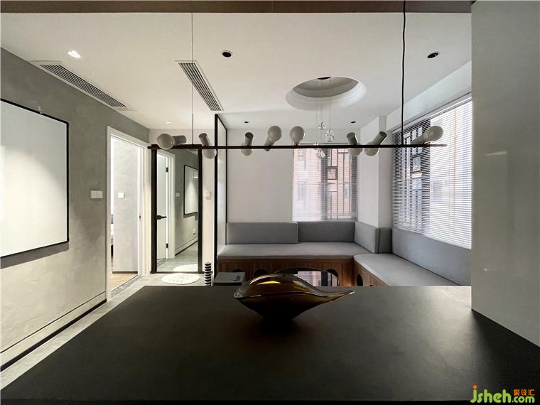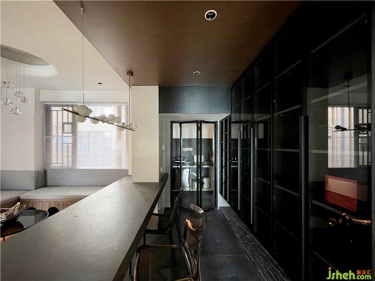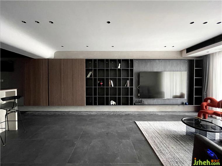 深圳家居设计木饰面鞋柜,木格栅餐边柜和电视背景墙在同一平面上,似有边界又无界限,彼此独立又不失整体的秩序性,天花的粱形成一个方块穿插于其中,灯带形成线,简单的点线面组合,却简而意赅地呈现了艺术的直观美。