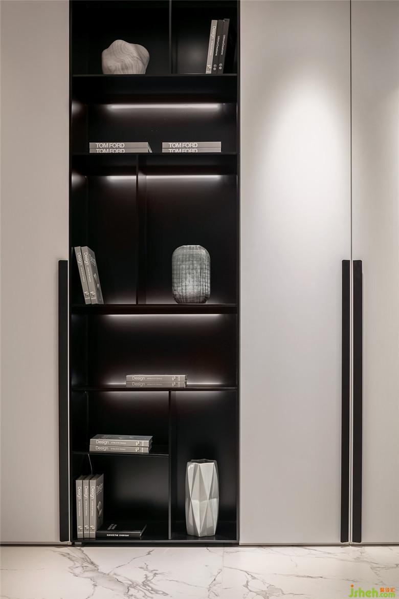 经典黑白色的半开式装饰柜设计配上冷色系的饰品,在整个展厅中俨然起到重要的作用,在隔断和装点整个空间之余,也能满足日常的储物功能。