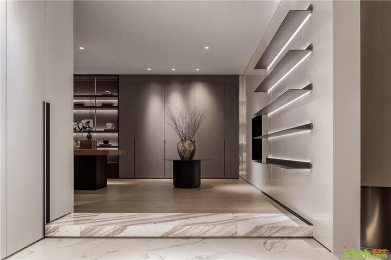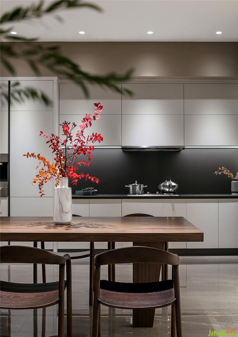 在入口右侧墙面的洞窗处,采用借景的手法,以一雅致的陶罐插上或长短粗细、或曲直顿挫、亦或强弱刚柔、虚实疏密的枝条。由内而外的散发出一种静静流淌的意境。