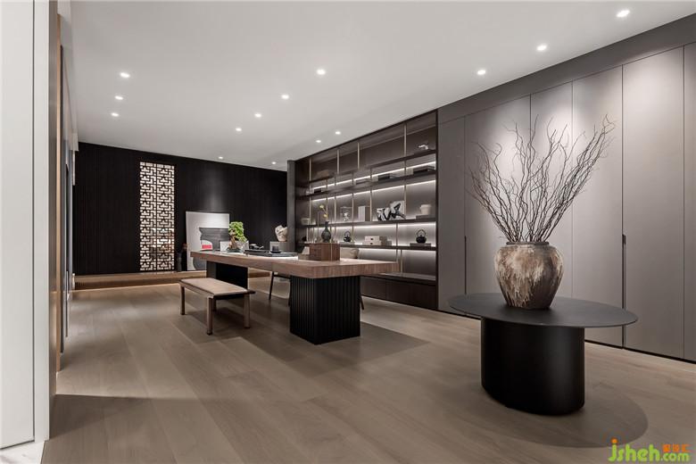 略带古韵风味的茶台,与一旁绽放的细碎又繁茂的花枝深浅呼应着。零星点缀在品茗区的这一抹抹绿色枝叶结合艺术家制作的精美器皿,旷达地摆放在茶台之上,在偌大的空间反衬下显得更为清雅且静宁。