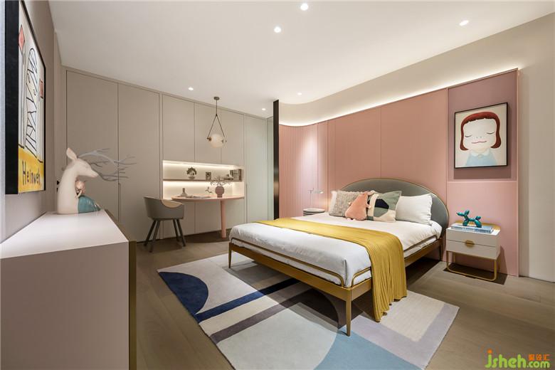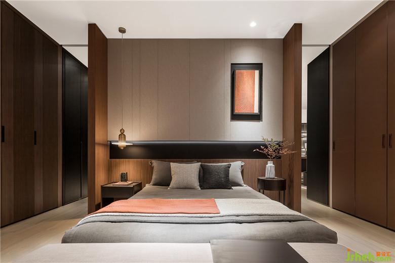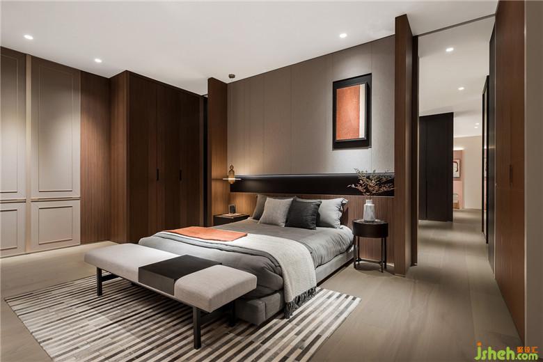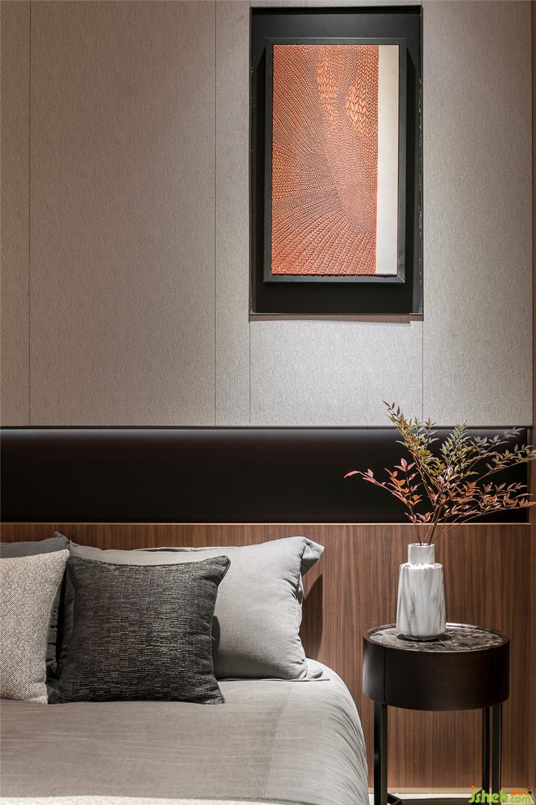 主卧以红褐色为主色,搭配上灰色系的床品,再点缀同色系的搭巾和插花,整个房间朴素又不失气质,设计师可谓心思缜密。