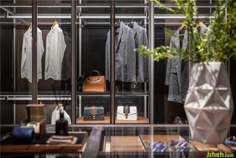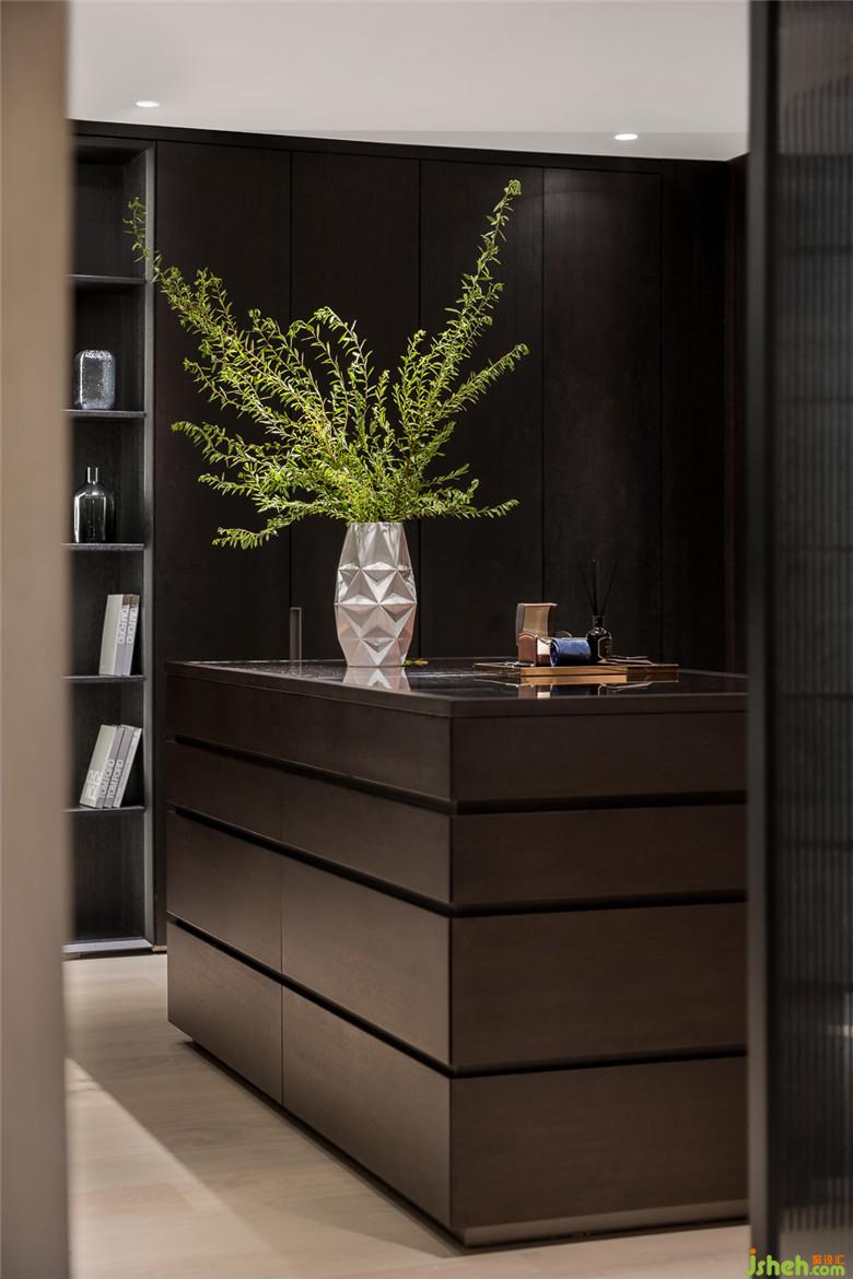 在充满古典气息的衣帽间,饰品柜上的错落有致、极具张力的绿枝搭配具有设计感的白色器皿,给整个衣帽间增添了一抹绿意。