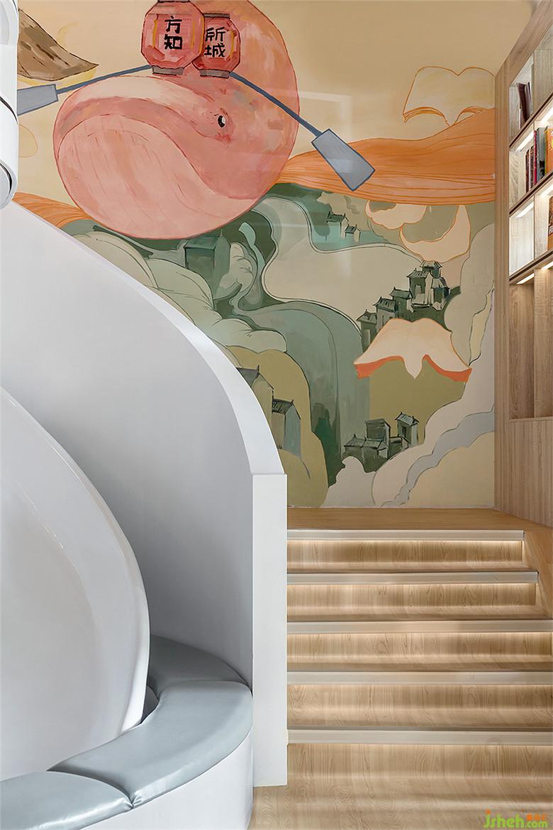 儿童区插画融入了山海城书的元素用具有中国特色的颜色绘制出,既有鹏城百年历史,又有深圳恢弘的未来呈现了一幅鹏城的奇幻历程。