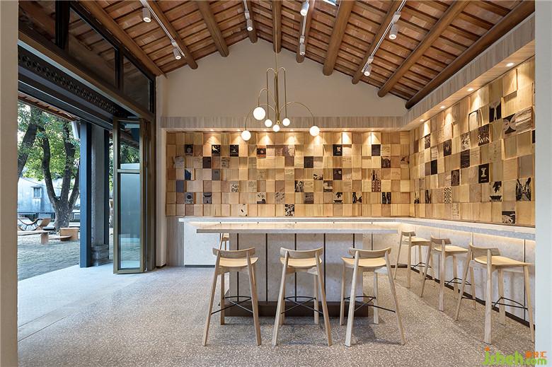 餐饮区墙面的设计采用了木头材质,给人会想要亲近触摸的感觉,上面贴着展示人类巨著以及一些可鼓舞人心的名句,也展示了古城的老影像。在顾客休息时可通过这些影像了解过去,触摸历史。