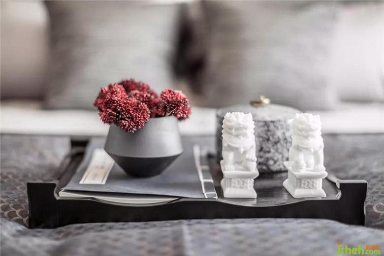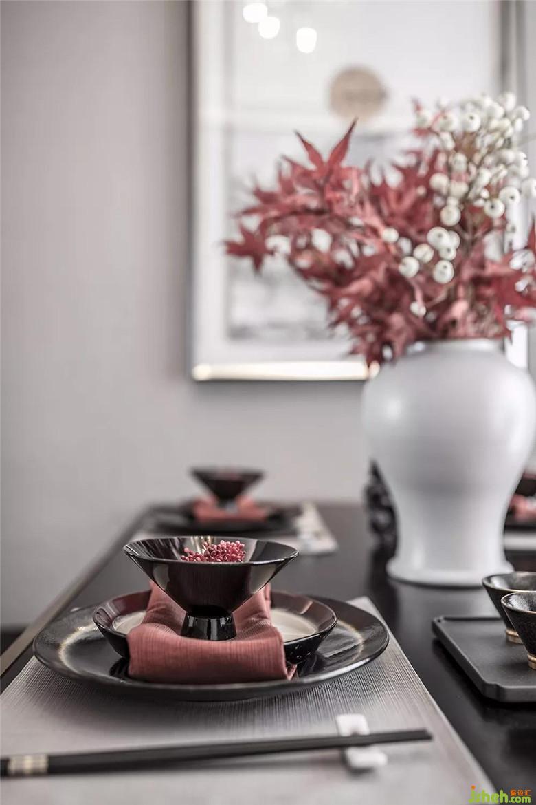 利用中国红、黑色木纹,营造出历史悠远的中国文化底蕴,餐具呈现出的饮食讲究,让人好不惬意