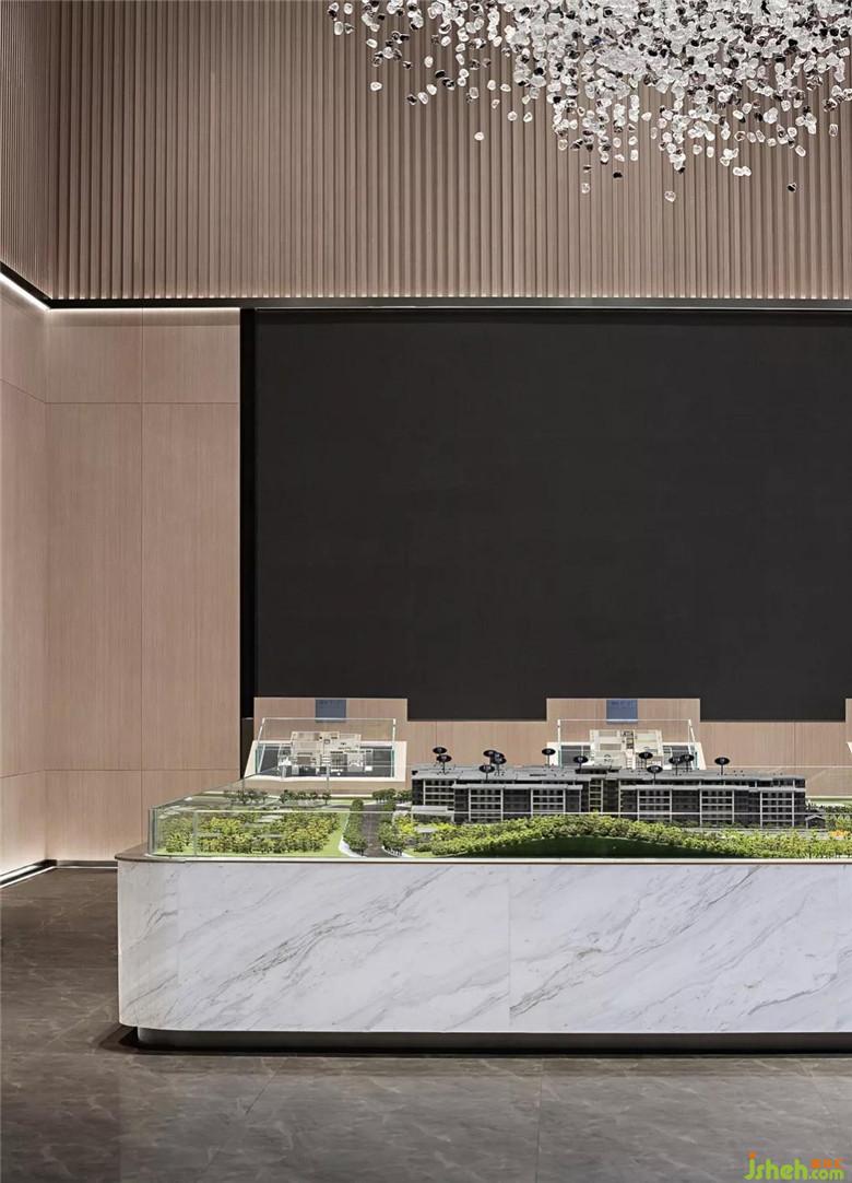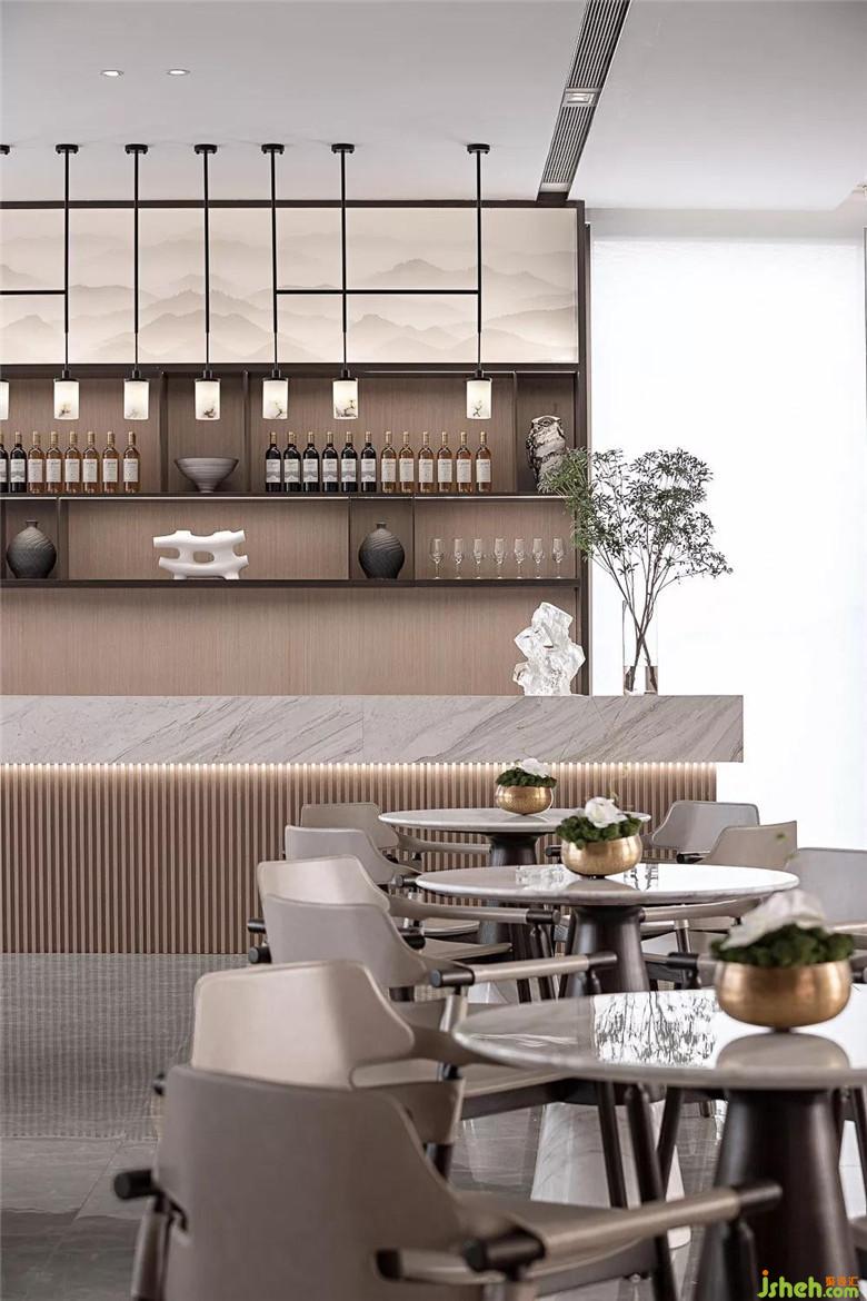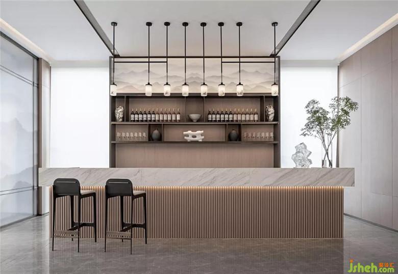洽谈区座位对称排布,疏落有秩,色彩如淡水墨渍染宣纸一般,雅白、卡其、原木色洋洋洒洒挥写,配合简约内敛的木材肌理,取得适宜生活的温度平衡。悬挂的山水纱帘,素雅的瓷器,未经打磨的天然原石等,同时散发出和谐统一的东方情调。