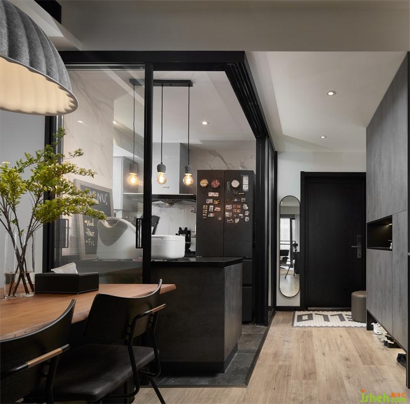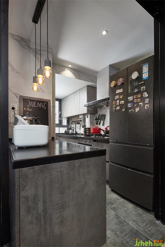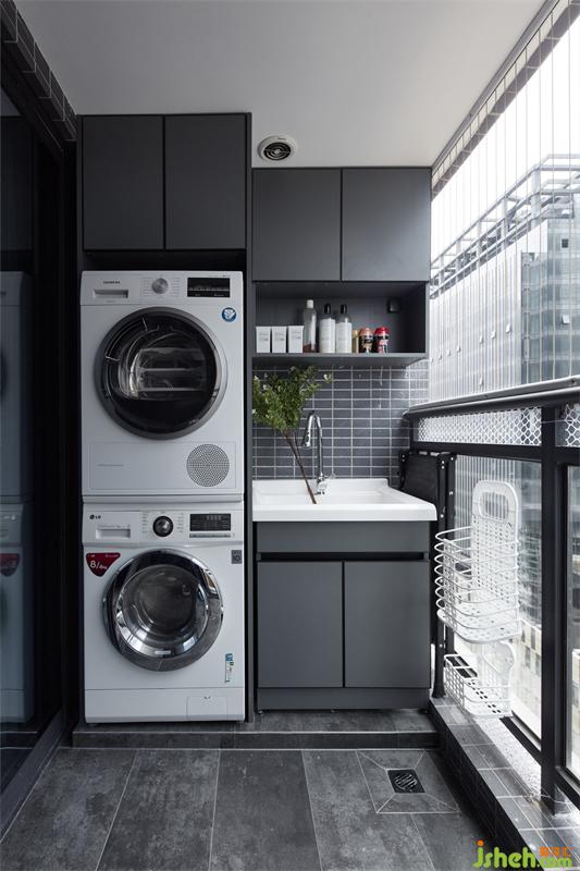 阳台一侧定制整墙储物柜,嵌入洗衣设备与洗手台,满足屋主需求。洗衣台底部抬高设计,防止洗衣机和柜体受潮,高级的灰色调铺满墙面地面,搭配深灰色柜体,表现得耐看而有层次感。