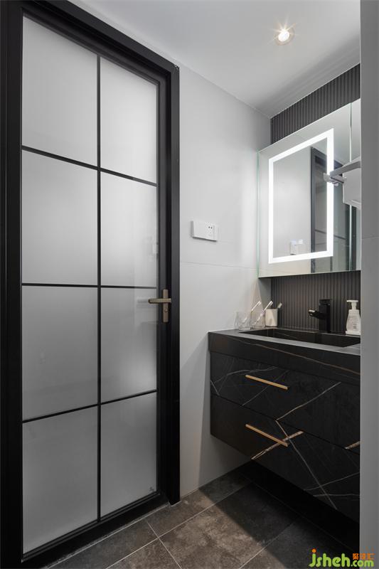 客卫将干区洗漱台单独分离出来,定制悬空式台上盆浴室柜,黑色大理石岩板完美呈现了石材的原生纹理,让整个空间时尚感爆棚。