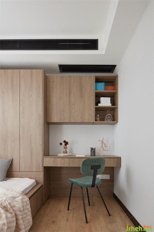 老人房将榻榻米床与衣柜书桌一体化设计,充分利用每1㎡,收纳空间翻倍。无把手的原木家具,没有过多装饰,整体给人以自然清新的氛围感。